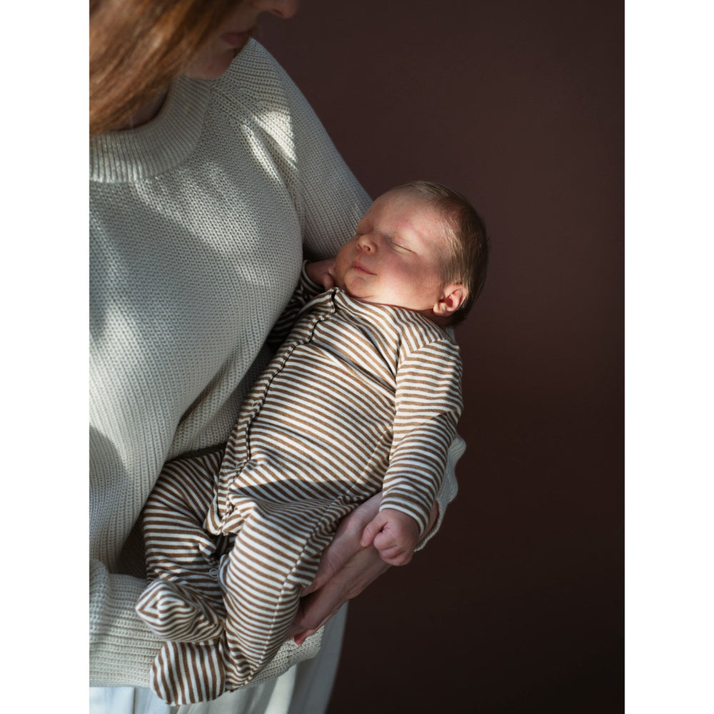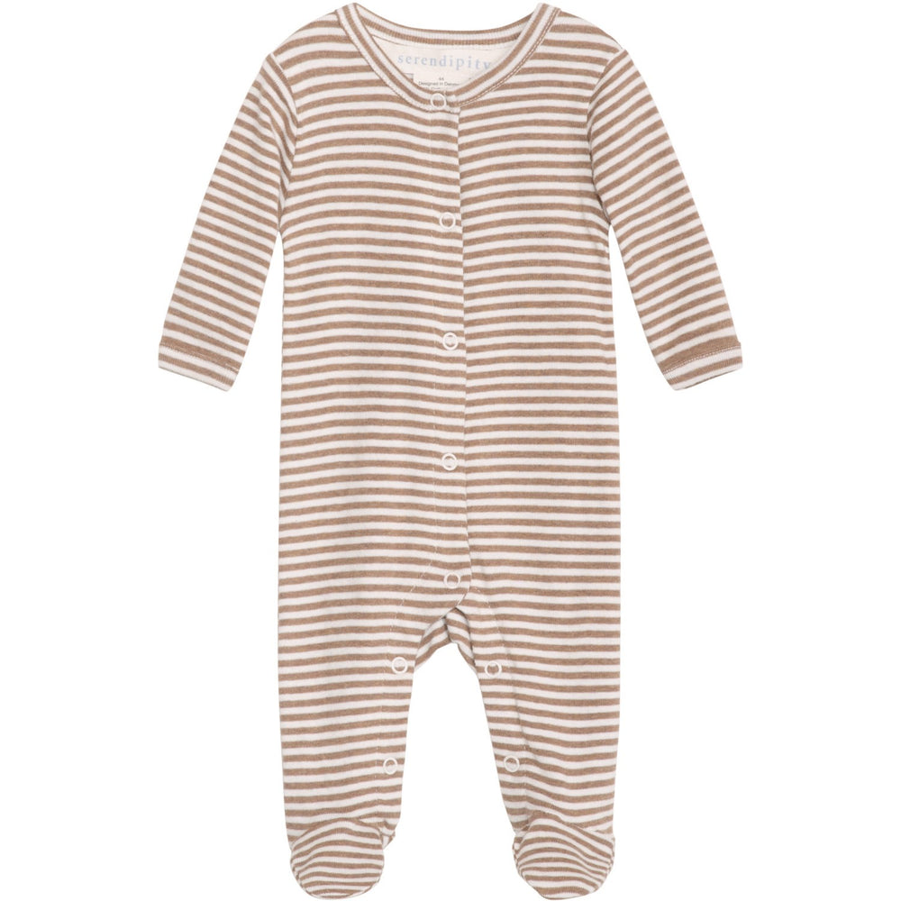 Oplev komforten med denne bløde, økologiske baby-heldragt fra Serendipity. Fremstillet i 100% GOTS-certificeret økologisk bomuld, sikrer den maksimal åndbarhed og blidhed mod dit barns hud. Designet med elegante mandelbrune og råhvide striber, denne dragt har en praktisk fuld åbning med trykknapper, der gør bleskift hurtige og lette. Perfekt til hverdagsbrug og særlige øjeblikke.