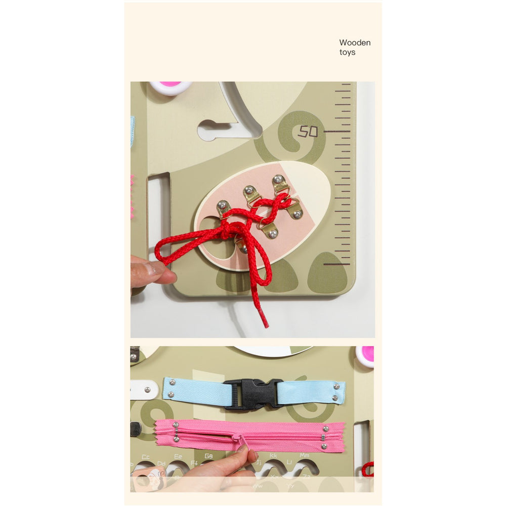 HEMMINGSEN Kids Grøn Langhals Aktivitetstavle kombinerer sjov læring og praktisk design. Denne 2-i-1 tavle er udstyret med en præcis højdemåler og varierede interaktive elementer som tandhjul, låse, et spejl og snørebånd, der fremmer udviklingen af finmotorikken og kreativ tænkning. Ideel til at engagere dit barns nysgerrighed, samtidig med at det giver glæde ved at observere og markere barnets vækst. Et kærligt tilskud til familiens daglige stunder.