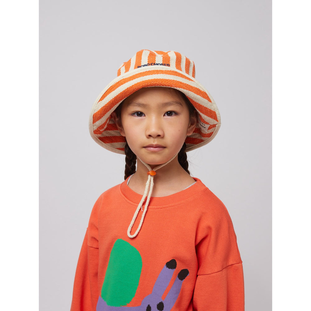 Giv dit barn en smart tilføjelse til garderoben med denne orange stribede bøllehat fra Bobo Choses. Lavet med økologisk bomuld, sikrer hatten både komfort og holdbarhed. Det legesyge stribede mønster og klare farver tilføjer stil, mens den brede skygge tilbyder solbeskyttelse. Perfekt til både hverdagsbrug og udendørs eventyr.
