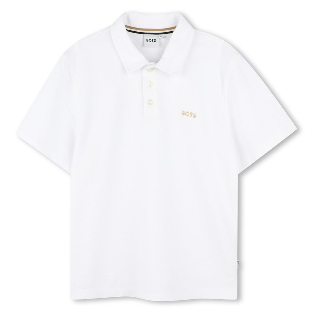 Oplev den stilrene Hugo Boss kortærmede polo til børn, fremstillet i 100% blød bomuldsjersey. Denne hvide polo prydes af et elegant broderet logo på brystet og et diskret vævet logomærke på siden, designet med en løs pasform for optimal komfort. Perfekt til både leg og særlige anledninger.