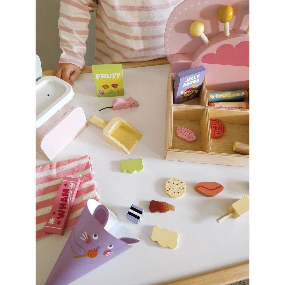 Lad legen begynde med Tender Leaf Slikbutik! Dette charmerende sæt er fremstillet i holdbart træ og designet til at stimulere børns fantasi og sociale færdigheder. Med en bred vifte af "slik" som vingummier og chokolade, opmuntrer det til rollespil og hjælper med at udvikle finmotorikken. Alt tilbehør er let at gribe for små hænder, og den medfølgende stofpose samt skabeloner til kræmmerhuse forstærker både orden i legen og kreativ udfoldelse. Ideel til børn mellem 3-5 år, dette legetøjssæt sikrer timevis af underholdning, samtidig med at det fremmer en tidlig forståelse for tal og vægt. En perfekt måde at bringe familien sammen på - leg, lær og del glæden.