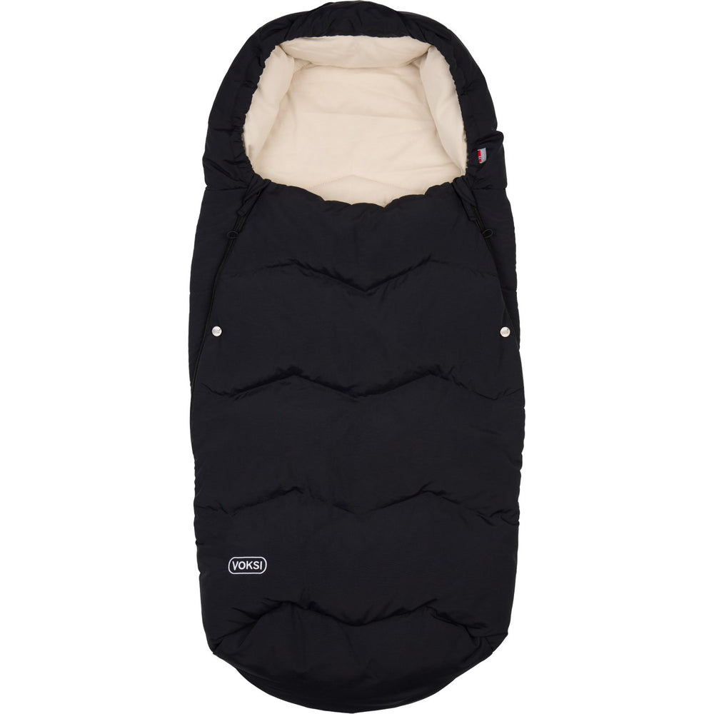 Voksi Explorer Sort Solid er fremstillet af naturlige og nøje udvalgte kvalitetsmaterialer som uld og dun. Køreposen har uld i ryggen, hvilket hjælper med at regulere barnets kropstemperatur, mens overdelen er fyldt med dun, som giver effektiv isolering og holder barnet dejligt varmt.