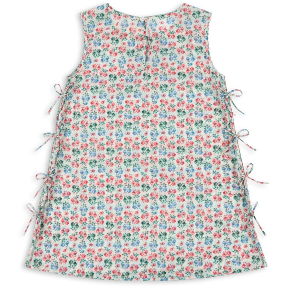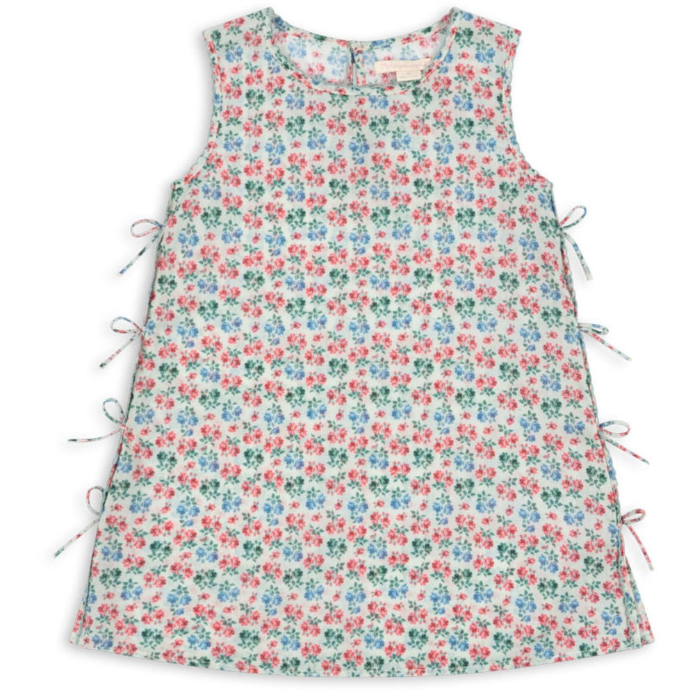 Konges Sløjd Evergreen Voila kjolen er perfekt til din lille prinsesse. Fremstillet i 100% bomuld, sikrer denne ærmeløse kjole en let og åndbar oplevelse. Designet i en flatterende lige silhuet med flæsekanter og fine sløjfer langs siderne, kombinerer den både stil og komfort. Kjolen er ideel til hverdagsbrug samt særlige anledninger, og kan nemt vaskes hjemme.