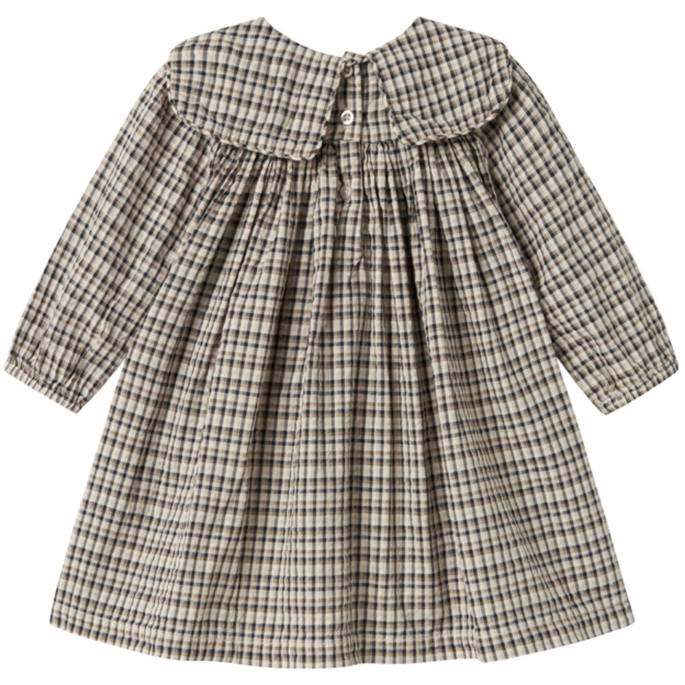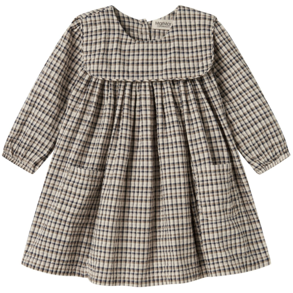 Denne langærmede babykjole fra MarMar er fremstillet i et seersucker check mønster i navy. Med sin løse pasform og store dekorative krave tilbyder den både stil og komfort. Kjolen har praktiske lommer foran og lettilgængelige knaplukninger bagpå. Perfekt til hverdagsbrug og særlige lejligheder, falder længden behageligt over knæet.