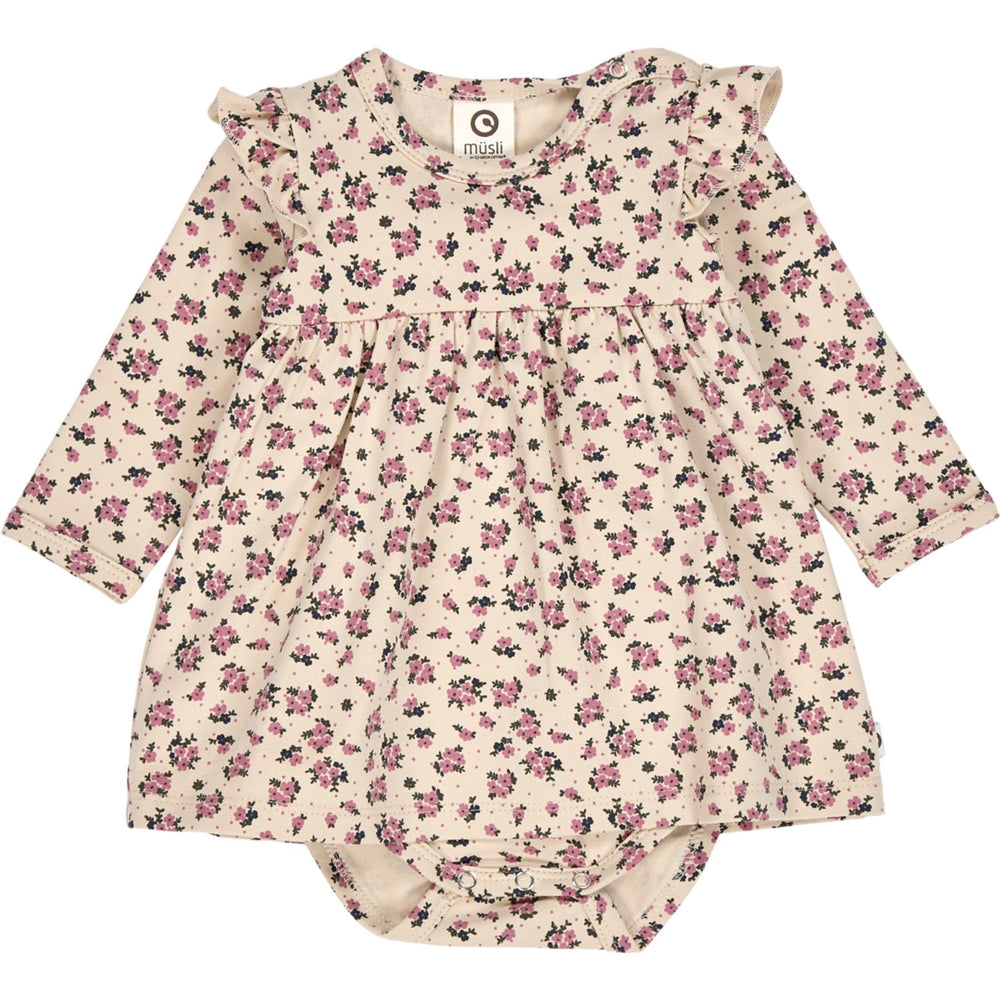 Denne charmerende Müsli Oak, Nostalgia Rose eller Deep Green Zinna kjole body er ideel til småbørn, der ønsker at se søde ud samtidig med, at komforten er i højsædet. Lavet af 95% GOTS certificeret økologisk bomuld og 5% elastan, sikrer den en blød og strækbar pasform. Det detaljerige blomsterprint og de dekorative flæser ved skuldrene tilfører et feminint touch. En praktisk kjole til hverdag og særlige anledninger.