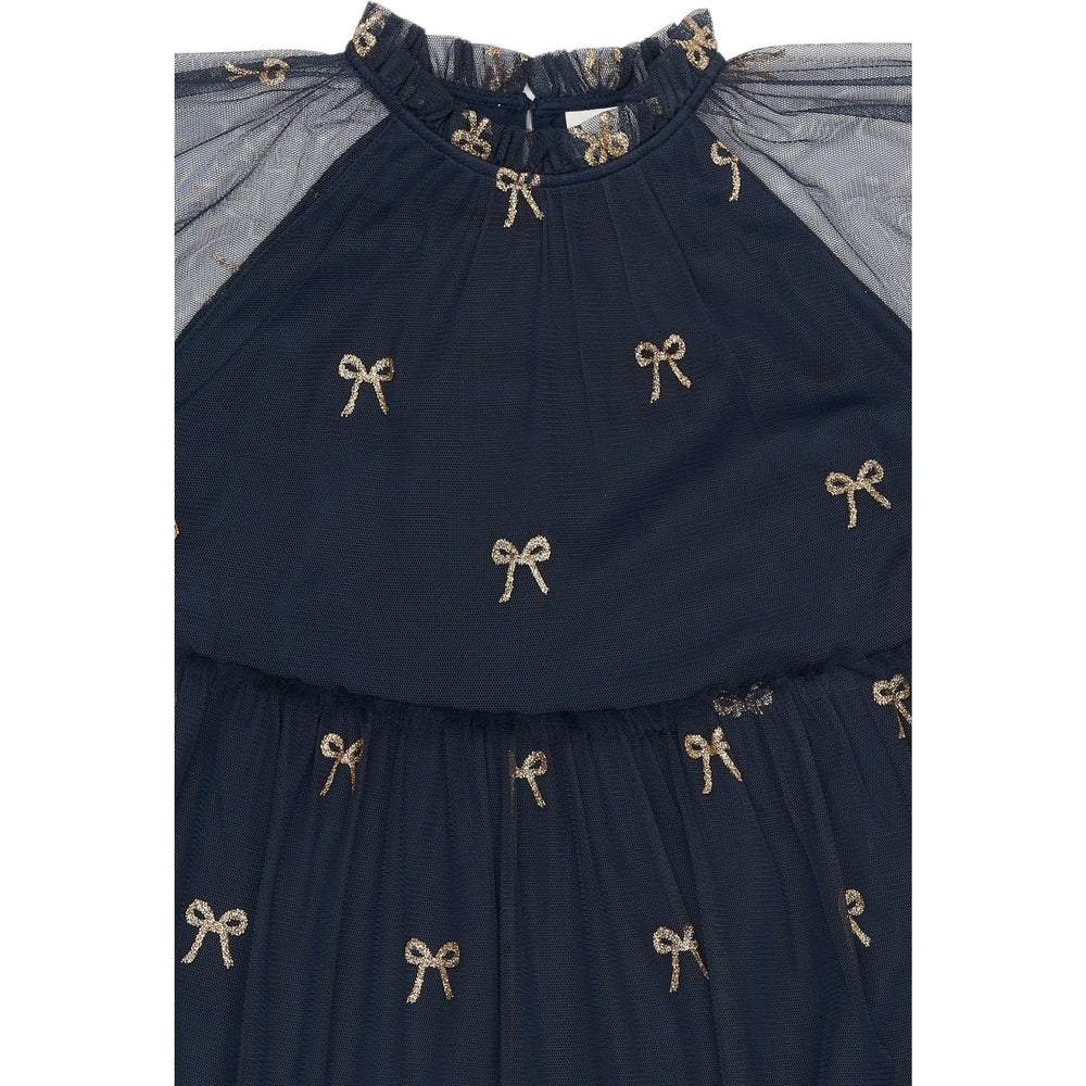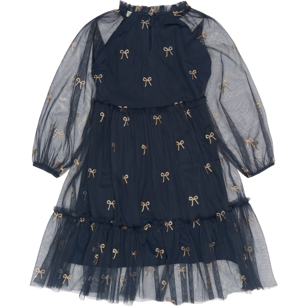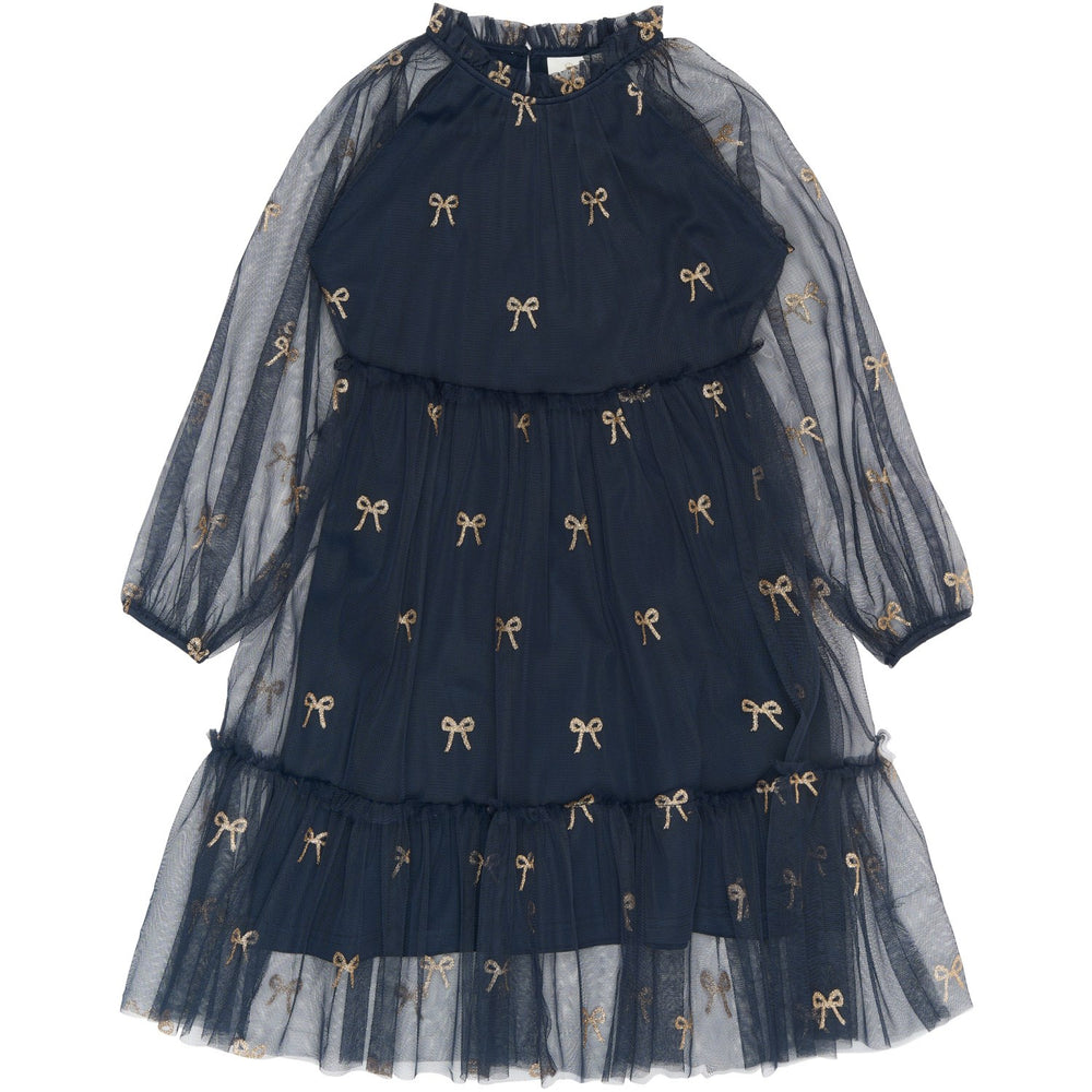 Denne charmerende kjole fra THE NEW er ideel til festlige anledninger med sit stilfulde to-lags design og yndefulde midi-længde. Kjolen kombinerer børnevenlig komfort med elegant design; en blød bomuldsunderkjole sørger for åndbarhed, mens det ydre lag af finmesh tilfører et let og drømmende look. Små guld-glimmer sløjfer tilføjer et strejf af glamour, og praktiske detaljer som knaplukning i nakken og elastiske manchetter sikrer en behagelig og nem pasform. En perfekt kjole til særlige øjeblikke.