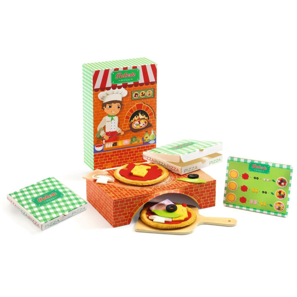 Giv dine børn timer af underholdning med Djeco Roberto Pizzasæt. Dette charmerende sæt indeholder alt, hvad der skal til for at åbne en lille legepizzeria: fra ruskindslignende pizzabunde og farverige filttilbehør til leveringsæsker og en autentisk trææske formet som en ovn. Med sættet følger en træmenu, der inspirerer til kreativ leg og hjælper med at strukturere bestillingerne.