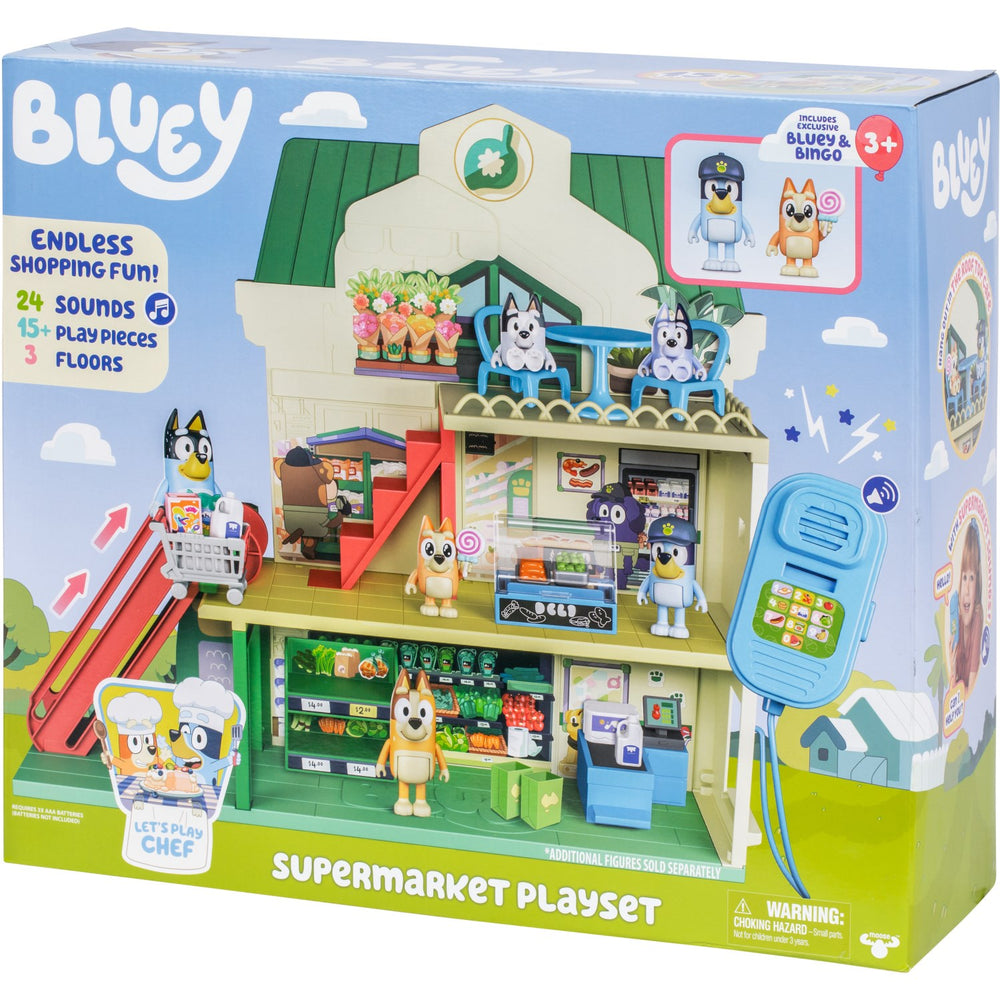 - Ekstra: Tag den ultimative shoppingtur i Bluey's supermarked med lyd og 3 etager! Legesættet indeholder 2 eksklusive figurer, 15+ butiksgenstande og en rulletrappe. Størrelse 46x40 cm. Alder 3+.