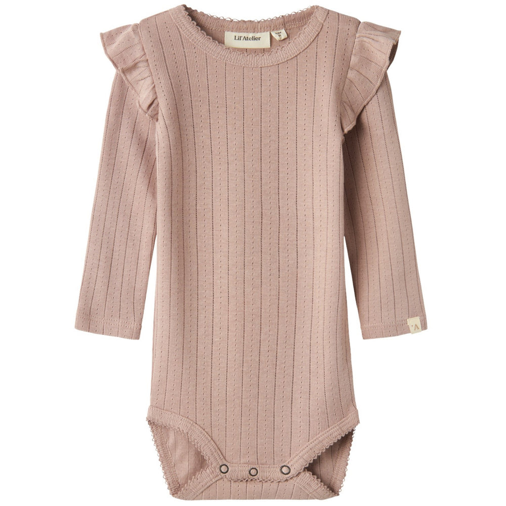 Gør din lille éns garderobe både stilfuld og komfortabel med denne Lil'Atelier Fawn Rachel Nan Slim Body. Fremstillet i en blød blanding af 50% økologisk bomuld og 50% TENCEL™ Modal, sikrer bodyen en glat følelse mod huden. Det unikke needle drop-design med hulmønster og dekorative flæser tilføjer en charmerende detalje. Den praktiske o-hals og lange ærmer er ideelle for køligere dage, mens trykknapperne gør påklædningen nem. Egnet til daglig brug, varer denne body lige så lang tid som den ser godt ud.