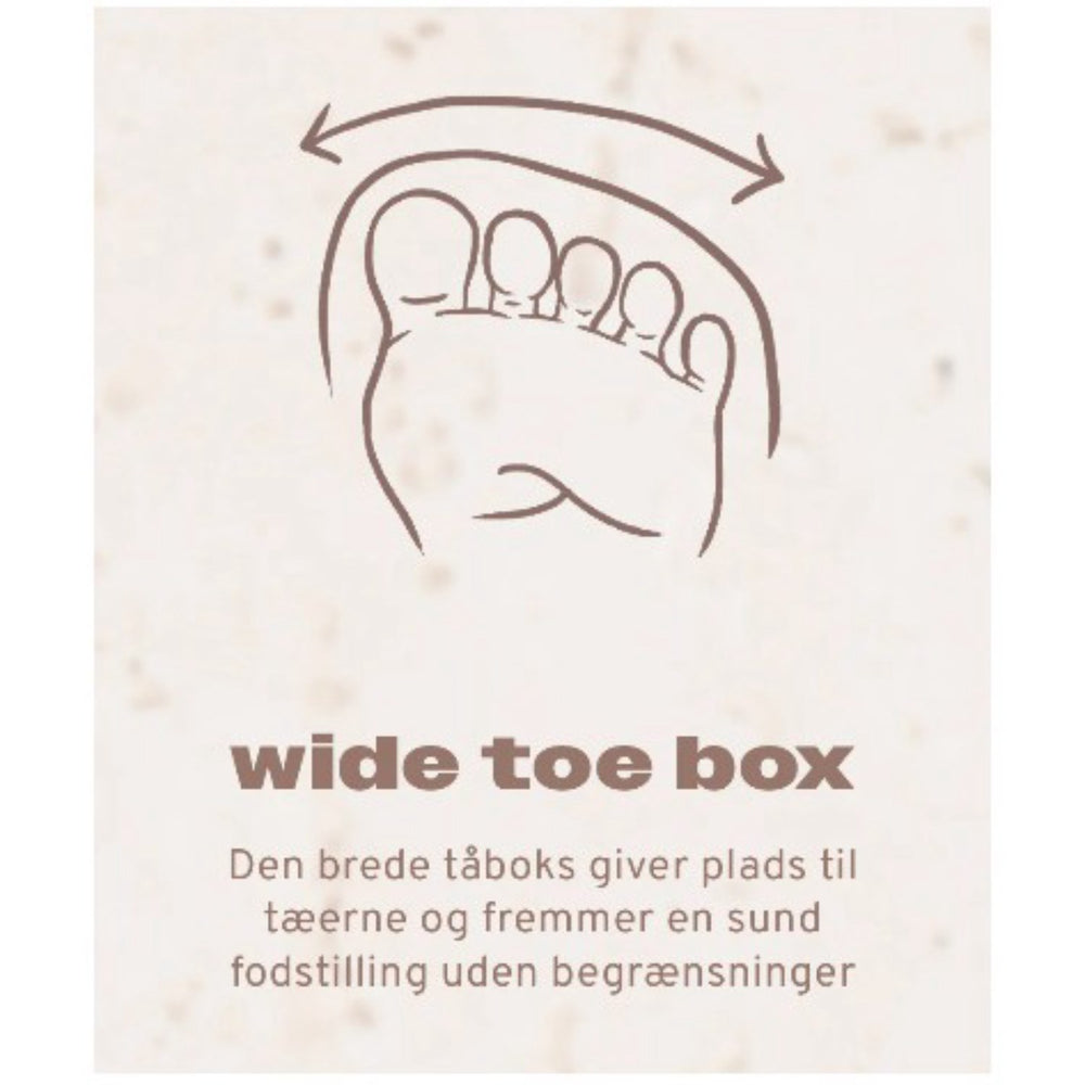 Disse sko er designet med en unik flad sål uden hældrop, hvilket er essentielt for at fremme en mere naturlig gang og bedre balance. Bred tåboks garanterer tilstrækkelig plads for tæerne, hvilket er afgørende for en sund fodstilling under barnets vækst. Ydersålen er produceret af lette, fleksible materialer, der tillader fødderne at bevæge sig frit og dermed støtter barnets fodudvikling.