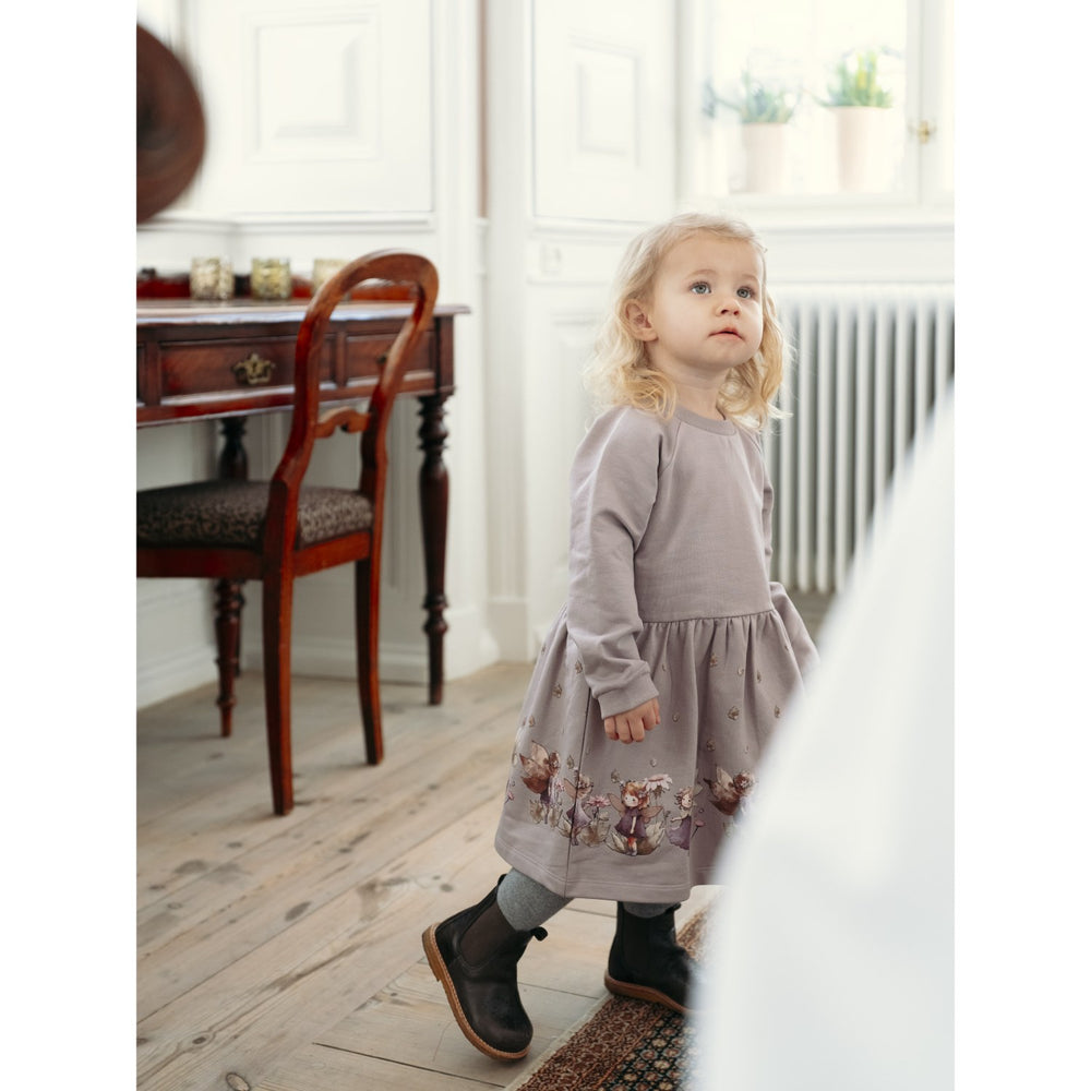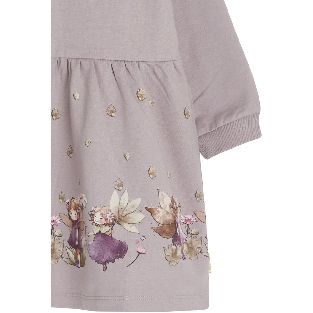Denne langærmede Hust & Claire Donna kjole er skabt i 95% økologisk bomuld, der sikrer en blød fornemmelse mod huden. Kjolen har et charmerende fe-print nederst og er designet med rynkede baner ved taljen, som tilføjer flot vidde. Den børstede bagside øger komforten, perfekt til børns leg og aktiviteter.