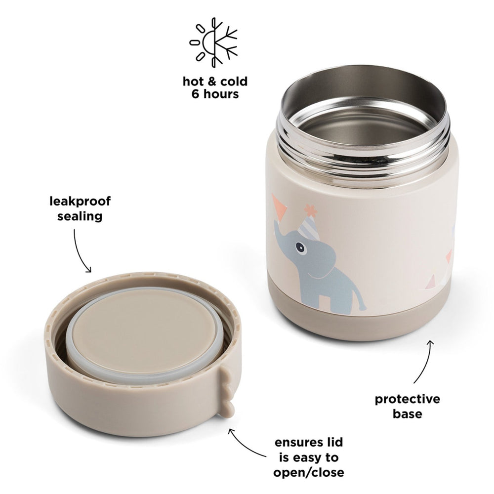 Giv dit barn den perfekte ledsager til måltider uden for hjemmet med DonebyDeer Sand Termo Madbeholder Celebration. Denne termobeholder på 300 ml er designet til nemt at åbne og lukke af små børnehænder. Med en tæt silikoneforsegling sikres det, at maden forbliver frisk, varm eller kold op til 6 timer, ideel til lange dage i børnehaven eller på eventyr udendørs. Spisepausen bliver mere spændende med et charmerende design af Birdee, Elphee & Lalee i en stilfuld sandfarve. Sikker og praktisk for småbørnsfamilier på farten.