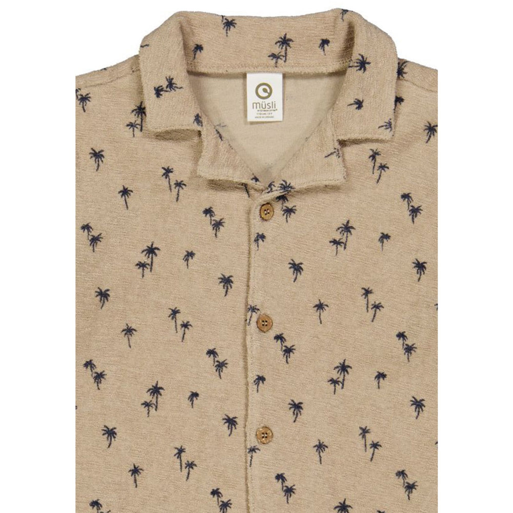 Skøn kortærmet Müsli Cashmere/Night Blue Palm skjorte til børn, fremstillet i 100% økologisk bomuldsfrotté, certificeret af GOTS (Ecocert Greenlife Lic. Nr. 151714). Designet prydes af et charmerende all-over print med små palmer, perfekt til sommerdage. Skjorten er blød og behagelig mod huden, ideel til børns aktive liv. Åbnes nemt med knapper af naturmateriale kokos, hvilket understøtter en bekvem pasform og let påklædning.