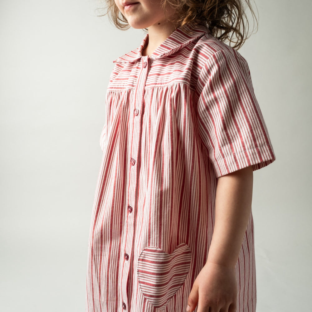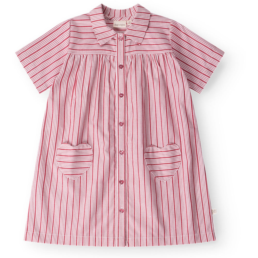 Denne charmerende kjole i klassisk rød med hvide striber byder på en stilfuld løsning til dit barns garderobe. Designet omfatter hjerteformede knapper og matchende lommer, der skaber et sødt og unikt look. Kjolen sikrer både komfort og praktisk anvendelighed, idet den er nem at tage på og vedligeholde. Et ideelt valg for både daglig brug og finere anledninger.