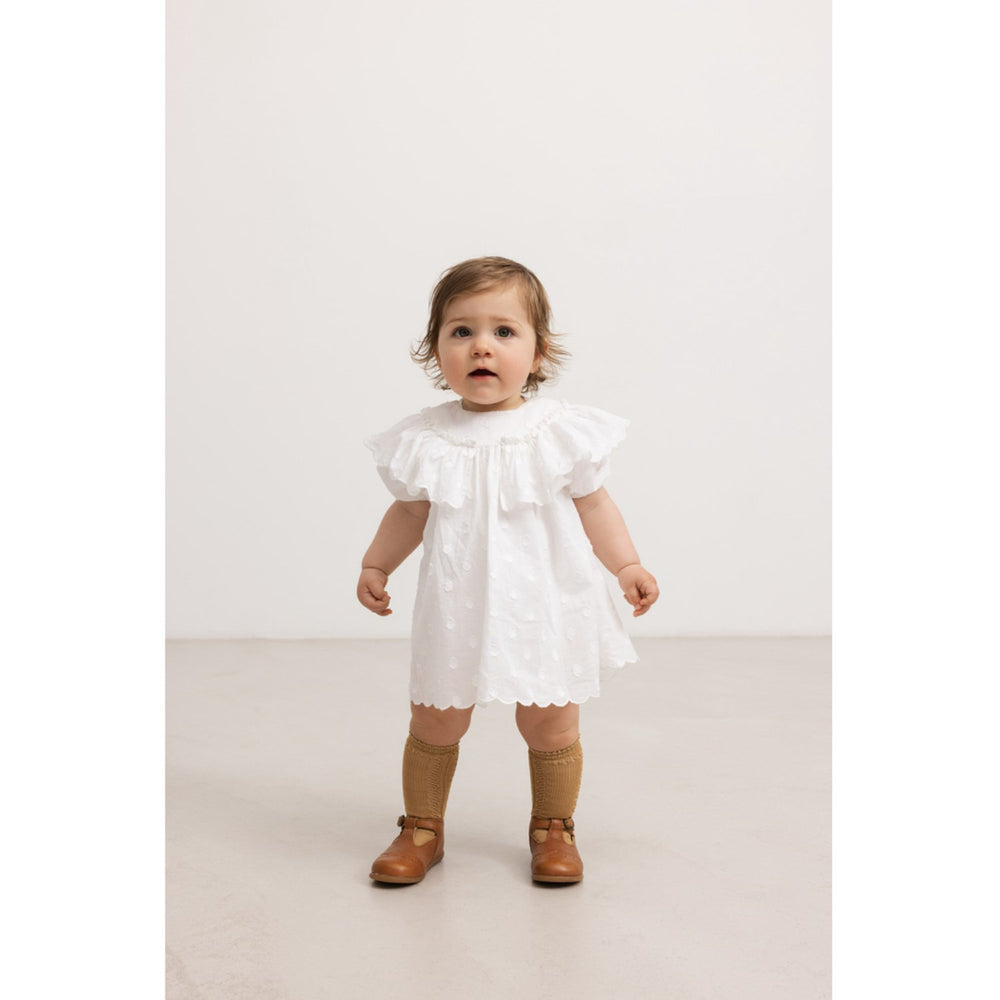 Dress din lille op i MarMar Dobby Dots Gentle White Delsa B kjolen, perfekt til enhver lejlighed. Denne charmerende kortærmede kjole har en elegant krave og praktiske knapper på bagsiden, der sikrer nem påklædning. Med sin behagelige pasform og længde til lige over knæene, tilbyder den både stil og komfort. Velegnet til daglig brug samt særlige begivenheder.