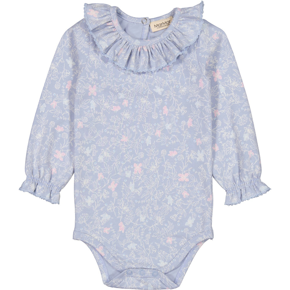 Denne langærmede MarMar bodystocking har en charmerende flæsekrave og flæsekant på ærmerne, hvilket tilføjer en fin detalje til designet. Fremstillet i blød jersey med elastan, sikrer den både stretch og komfort, ideel til barnets bevægelighed. Lukkes nemt med trykknapper bagpå og mellem benene for praktisk bleskifte. Tøjet opretholder form og farve selv efter gentagen brug. Certificeret Oeko-tex®, fri for skadelige kemikalier.