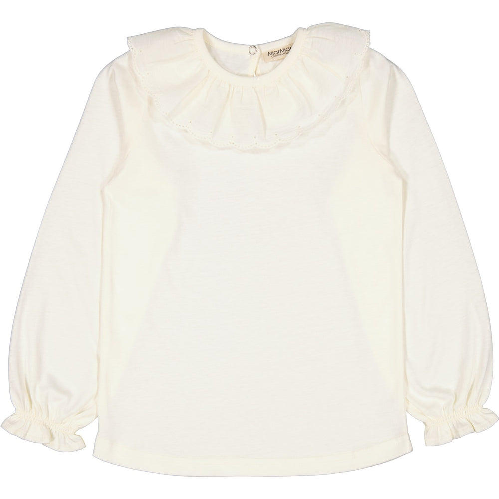 Denne MarMar Modal Fine Cloud Talla Flæse Skjorte til børn er fremstillet i blødt og strækbar jersey, der sikrer komfort hele dagen. Denne langærmede bluse har en charmerende rund krave udsmykket med hulmønster detaljer, praktisk elastikkant ved håndled og diskret knaplukning på ryggen. Materialer er Oeko-tex® certificeret, fri for skadelige kemikalier, hvilket gør den ideel til børns følsomme hud.