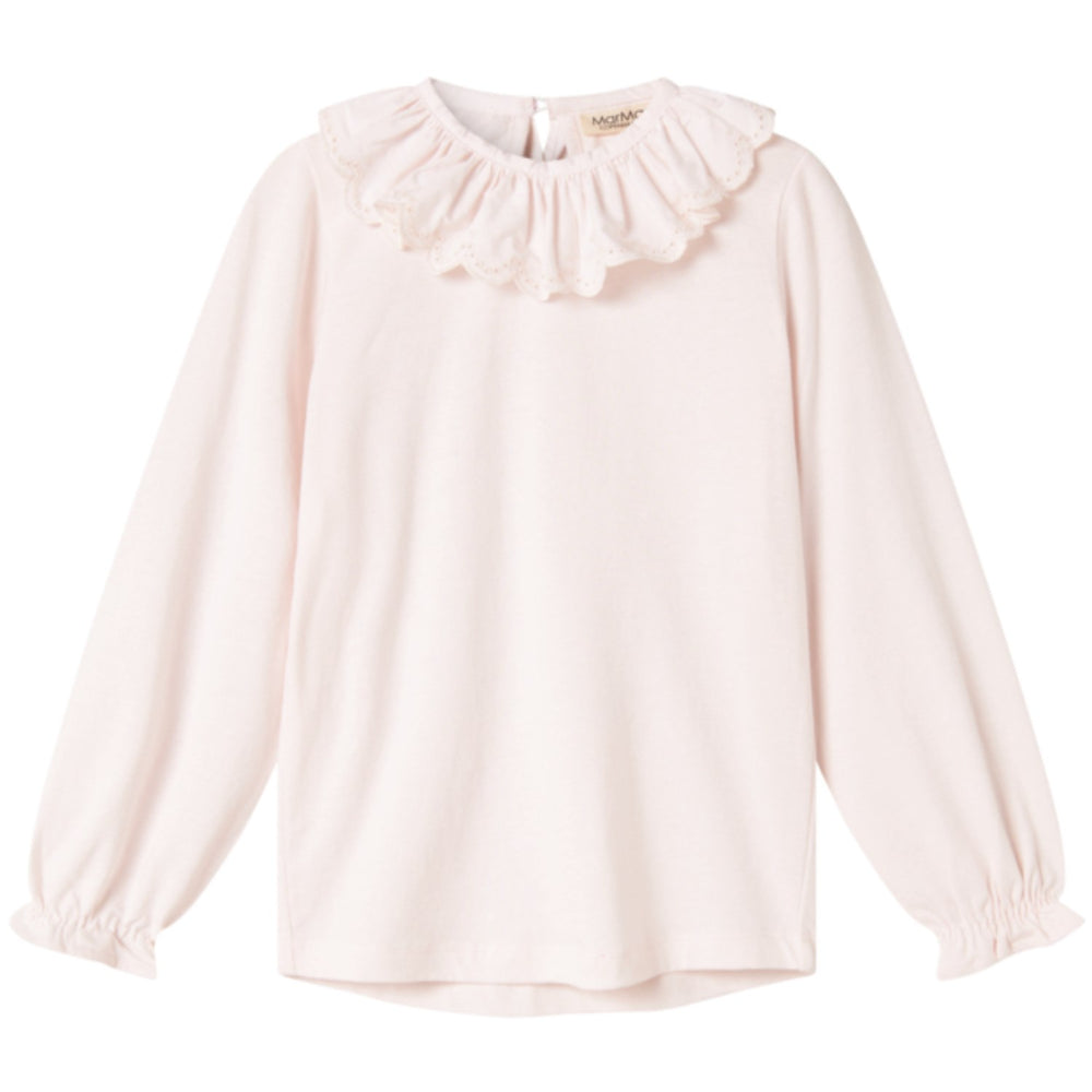 Denne langærmede MarMar Modal Fine Lilac Frost Talla Flæse Bluse fremhæver barnets garderobe med sine delikate blondedetaljer og den bløde lilla frostfarve. Designet med rund krave, elastiske manchetter og praktisk knaplukning bagpå sikrer en behagelig pasform og let påklædning. Perfekt til både hverdagsbrug og særlige lejligheder.