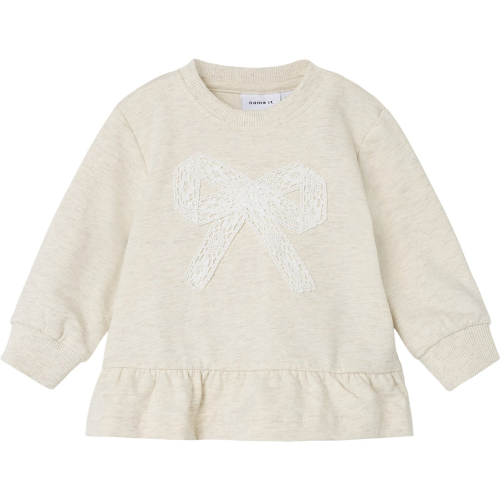 Byd velkommen til Name It Peyote Melange Hush Light Sweatshirt, perfekt for deres hverdagseventyr. Denne sweatshirt er lavet af ubørstet sweatstof, hvilket sikrer en glat ydre overflade og bløde løkker på indersiden for maksimal komfort. Med praktiske ribmanchetter, langærmet design og en klassisk rund hals, kombinerer den funktionalitet med stil. Det detaljerige med blondedetaljer tilføjer et unikt præg, mens den almindelige pasform garanterer en behagelig anvendelse. Sikkerhedsadvarsel: Holdes væk fra ild.