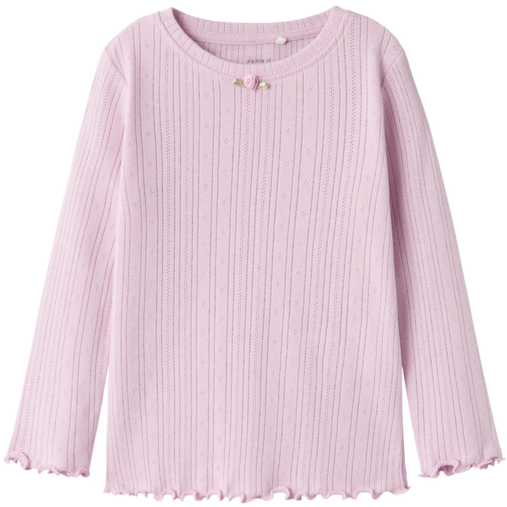 Denne elegante Name It Winsome Orchid Silke Slim Bluse er fremstillet i blød ribstrik, der sikrer optimal komfort med dens fine elasticitet og lodrette stribemønster. Med en klassisk rund hals og lange ærmer afsluttet med babylock kant manchetter, tilbyder denne top både stil og en skøn pasform. Perfekt til hverdagsbrug såvel som særlige lejligheder.