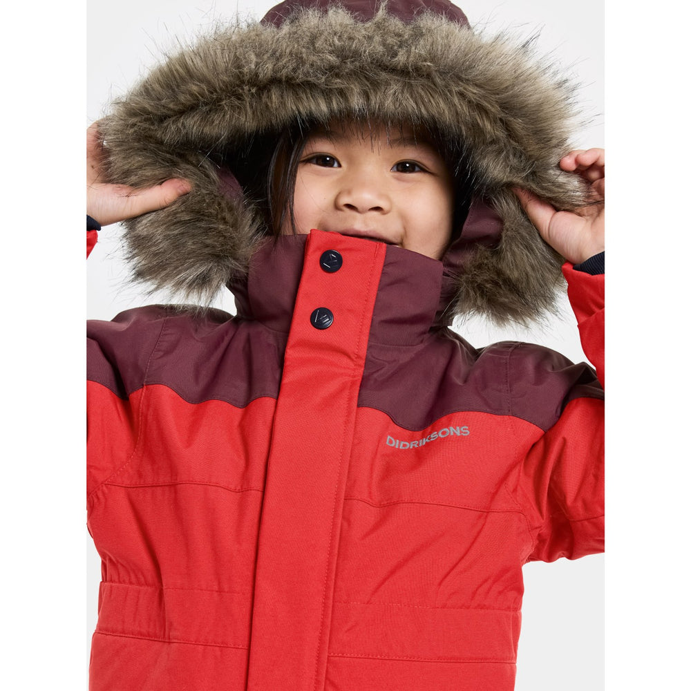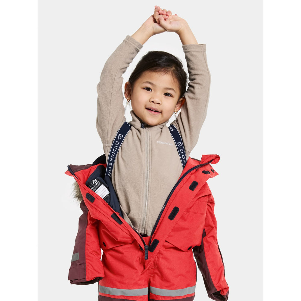 Gør vinterlegene varme og sikre med Didriksons Pomme Red Bjärven Kds Cover 4 flyverdragt. Denne holdbare dragt er udstyret med en justerbar, aftagelig hætte med syntetisk pels og ergonomisk snit, der sikrer optimal bevægelsesfrihed. Reflekser på ben, ærmer og logoprint øger synligheden i lavt lys. Praktiske justeringer ved ærme- og benender samt flere lommer inkluderer en sikker liftpaslomme. Perfekt til aktive børn, der elsker udendørs eventyr!