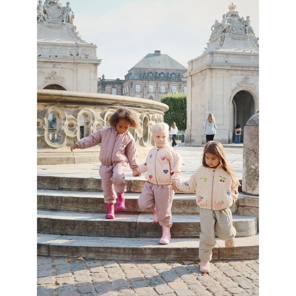 Oplev Konges Sløjd Frappé Juno Paliet Bomber Jakke, en letsindig termojakke perfekt til aktivt udendørsliv. Jakken er udstyret med polyesterpolstring, der sikrer optimal isolering, mens den fluorfri imprægnering tilbyder vind- og vandafvisning. Det unikke pailletmønster på ryggen tilføjer et sjovt og stilfuldt touch, ideelt for børn, der elsker at udforske i stil. En ypperlig kombination af funktionalitet og design til dit barns garderobe.