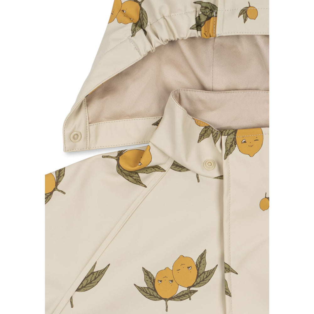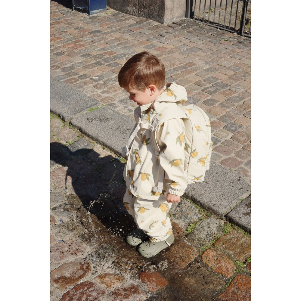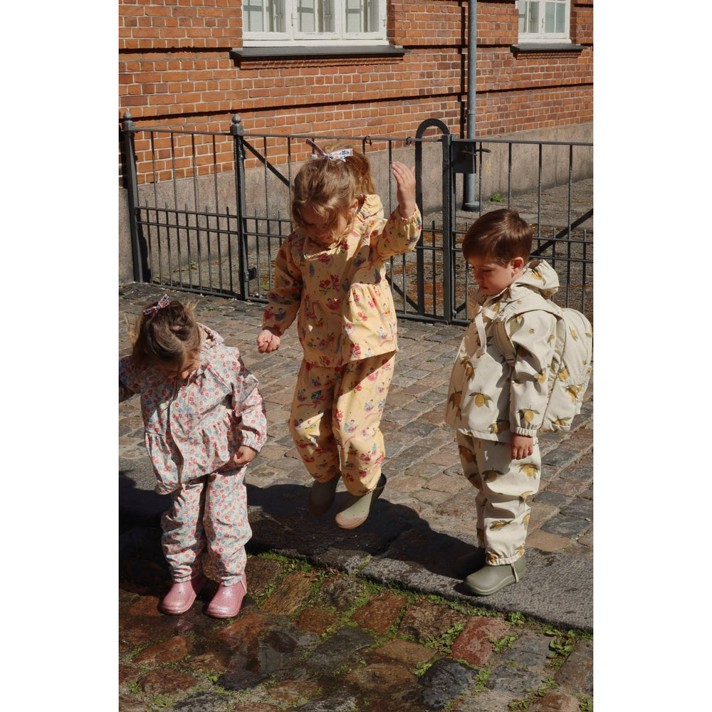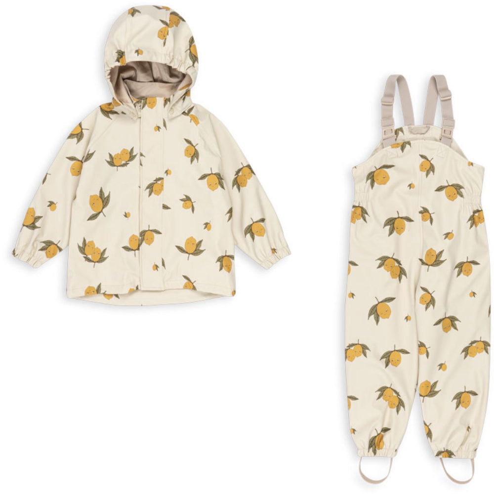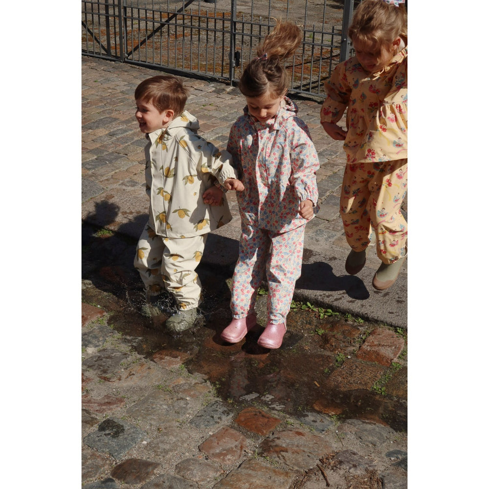 Gør regnvejrsdage sjovere med Konges Sløjd Sweet og Sour Rainy Palme Sæt. Dette charmerende regntøjssæt er vindafvisende og vandtæt takket være robust polyurethan og har svejsede sømme, der sikrer tørhed i vådt vejr. Designet med barnets komfort i tankerne, inkluderer sættet en blødt foret, aftagelig hætte og elastiske manchetter, der skaber en perfekt pasform. For de mindste op til 4 år er bukserne udstyret med seler, mens størrelserne 5-6 år og opefter har en praktisk elastik i taljen, der gør dem lette at tage på og af. Certificeret med OEKO-TEX® STANDARD 100, klasse 1, garanterer dette sæt ikke kun stil og funktionalitet, men også sikkerhed og kvalitet.