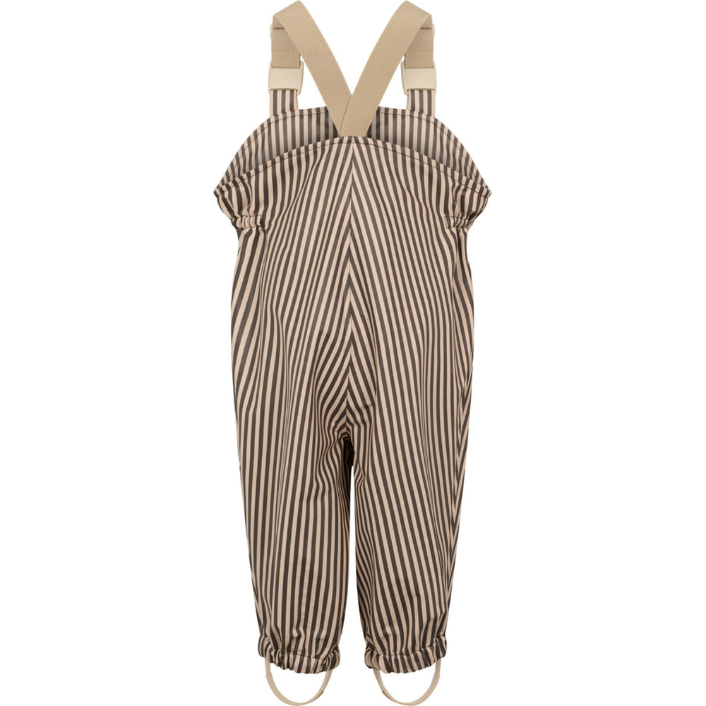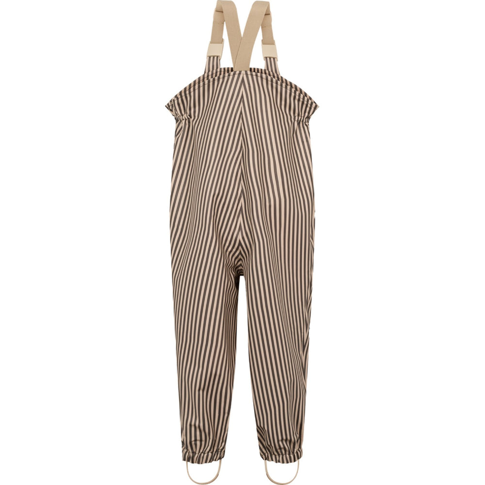 Dette MarMar Oddy sæt i regntøj er ideelt til aktive børn. Bukserne, udstyret med justerbare seler og elastik i taljen, sikrer en behagelig pasform, mens jakken, forsynet med en praktisk forlomme, lynlås og trykknapper, tilbyder nem påklædning. Det stribede design i brun nuancer gør det stilfuldt under alle vejrforhold.