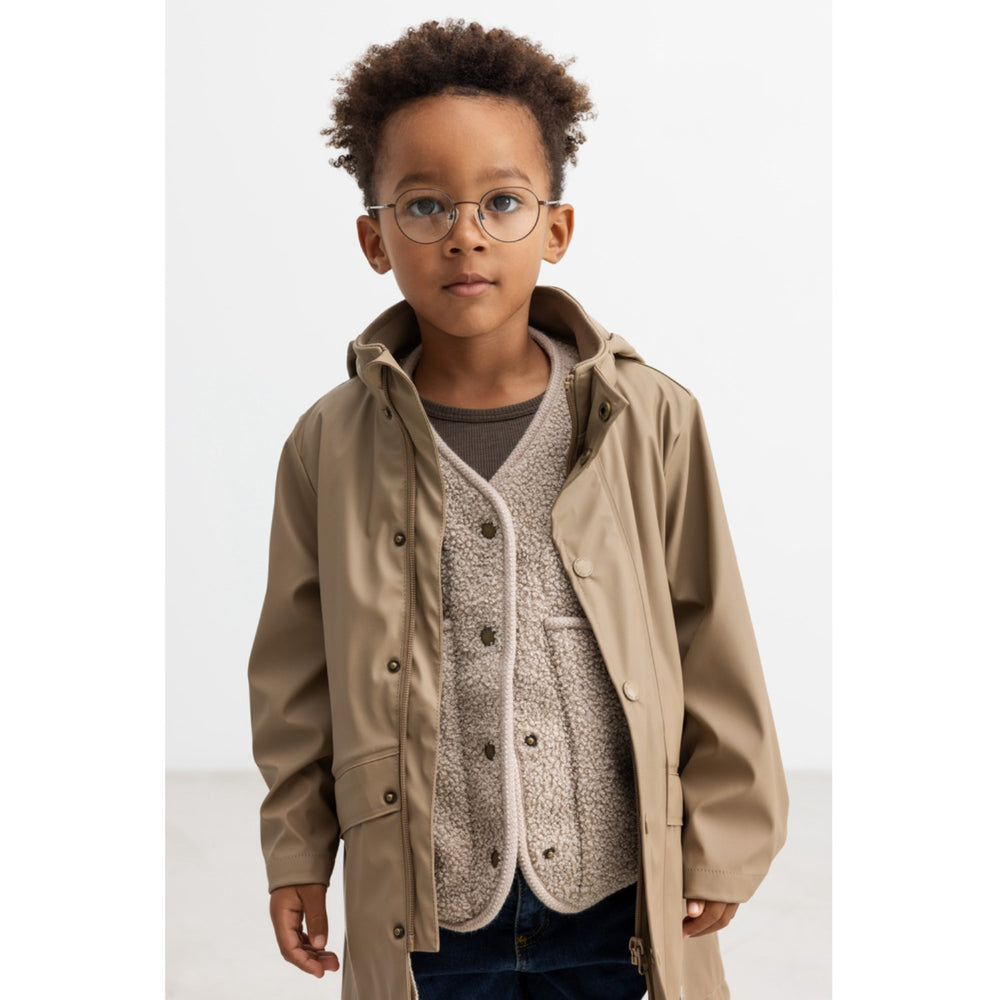 Denne elegante MarMar Rainwear sepia-brune regnjakke er perfekt til efterårsvejret. Udstyret med en aftagelig skyggehætte og to store forlommer, sikrer nem opbevaring og praktisk anvendelighed. Jakken har lynlås samt trykknapper, og justérbare ærmemanchetter for ideel pasform og komfort. Lang model der holder dit barn tørt og tilpas.