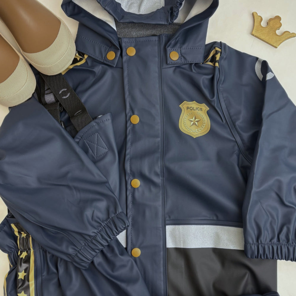 Dette børneregnsæt fra mikk-line i spændende polititetema er perfekt til udendørs leg i vådt vejr. Sættet omfatter vandtætte regnbukser og en regnjakke, begge med stærke reflekterende detaljer for øget sikkerhed. Beklædningen er designet med praktiske justerbare seler, elastiske manchetter og aftagelig hætte, hvilket sikrer optimal pasform og beskyttelse. Materialekvaliteten er høj med yderstof i 66% genanvendt polyester og 34% polyurethan, mens den indvendige foring er i 100% polyesterfleece, der holder barnet varmt. Med et vandtryk på 5.000 mm tilbyder sættet fuld vandtæthed samt vindtæthed, og det er nemt at rengøre. Et must-have for aktive børn, der elsker at udforske naturen, uanset vejret.