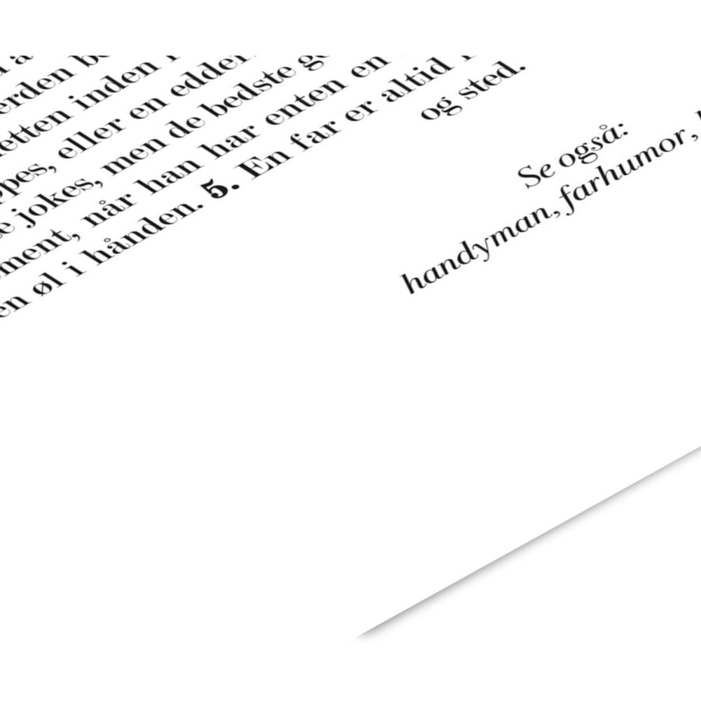 Citatplakat "Far Definition" er en unik og følelsesladet dekoration, der fejrer farrollen med stil og varme. Ideal til at personliggøre ethvert børneværelse eller som en tankefuld gave til fars dag. Dette design kombinerer kærlighed og æstetik, hvilket skaber en både rørende og stilfuld tilføjelse til hjemmet. Plakaten, trykt på FSC-certificeret papir, understøtter både kunstnere og miljøet, mens dens tidløse udtryk bevarer værdi gennem årene. Perfekt til at forevige familiekærlighed og samhørighed i hjemmets hjerte.