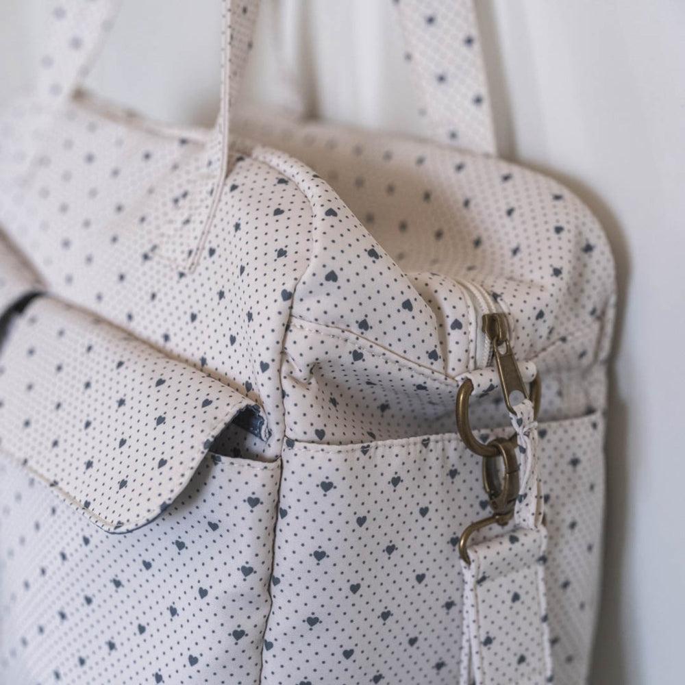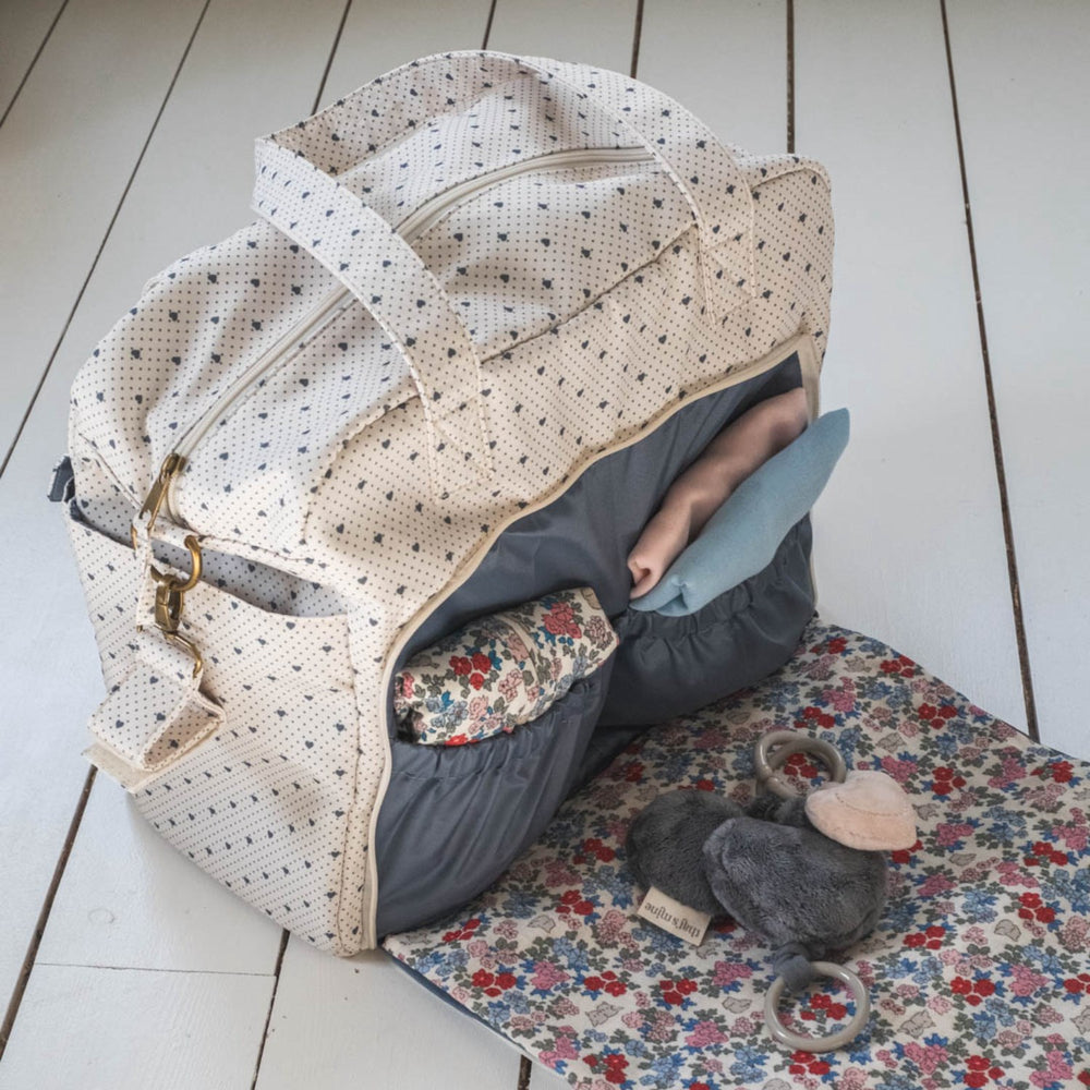 Opgrader hverdagen med That's Mine Lots of Love Sky Benne pusletaske, designet for at gøre livet nemmere for moderne forældre. Denne alsidige taske er fyldt med funktionelle lommer til alt fra flasker til vådservietter, og termisk foring i dobbeltlommen beskytter babyens mad og drikke. Med en aftagelig puslemåtte integreret i en rummelig yderlomme, tilbyder den fleksible opbevaringsløsninger uden at gå på kompromis med stil. Magnetiske knapper og nemme lynlåse gør åbning enkel med én hånd, perfekt når du jonglerer med forældreansvar. Fremstillet af holdbart genanvendt polyester, der er let at vedligeholde – ideel til den travle familie på farten. Mål: W18 x L40 x H34 cm.