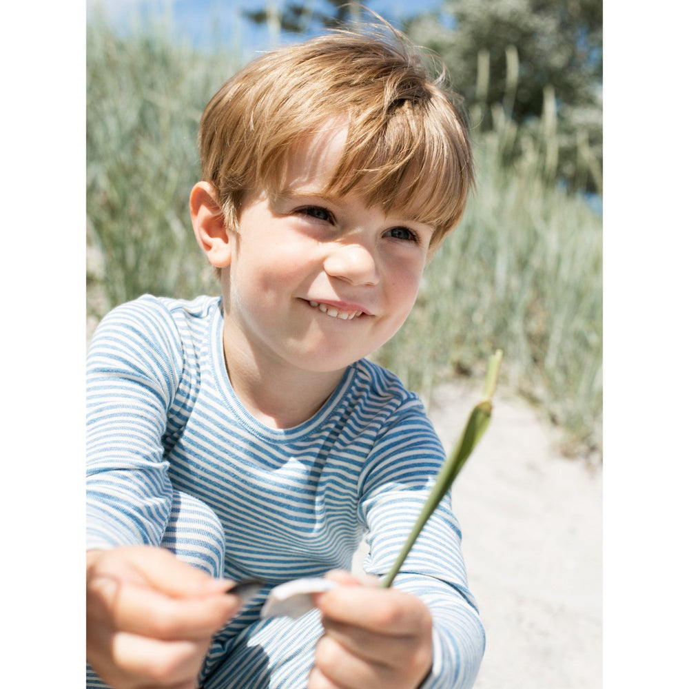 Hold dit barn behageligt og stilfuldt med vores Straight fit leggings i azurblå og råhvide klassiske melerede striber. Disse leggings er fremstillet af 100% økologisk bomuld og er GOTS-certificerede, hvilket sikrer både komfort og kvalitet. Blød elastik i taljen giver en perfekt pasform, der følger barnets bevægelser. Ideelle til hverdagsbrug og nemme at vedligeholde.