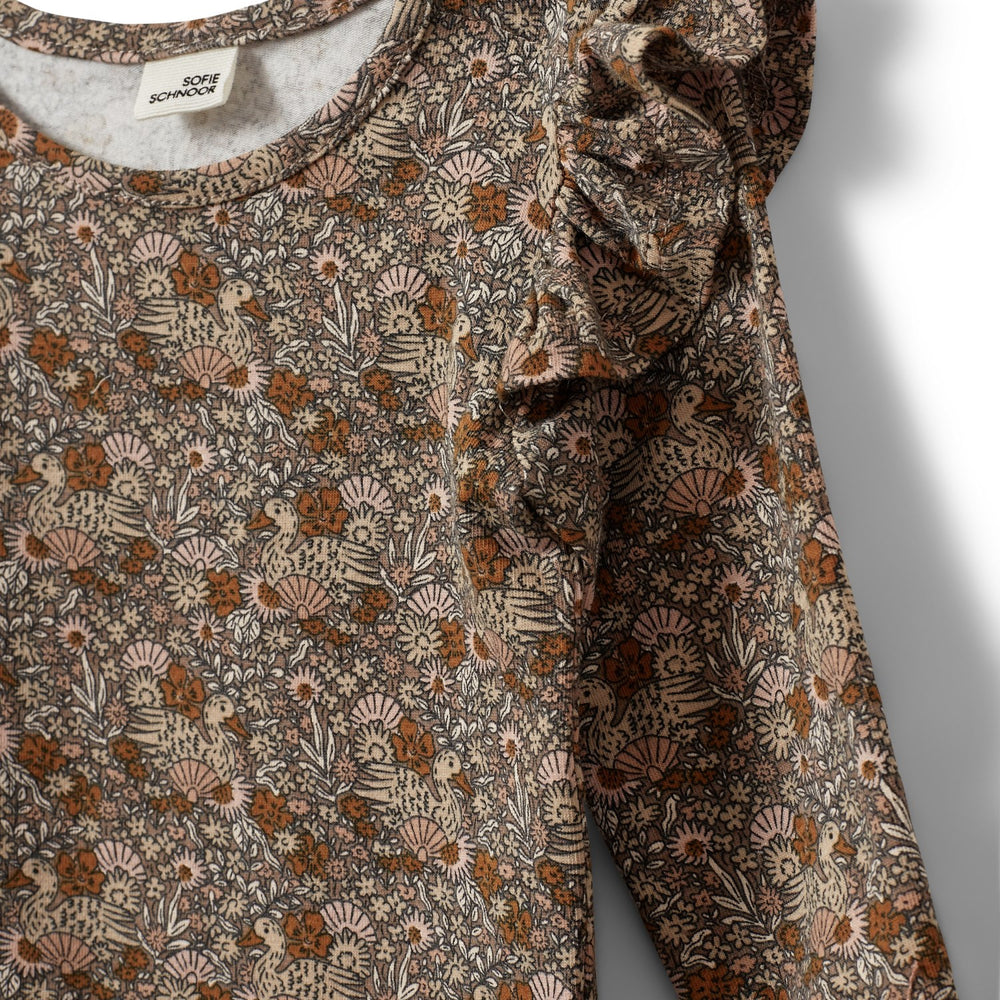 - Ekstra: • Brun blomstret bodystocking med små ænder • Lange ærmer og søde flæser på skuldrene. • Fremstillet af en blanding af bomuld, modal og spandex.