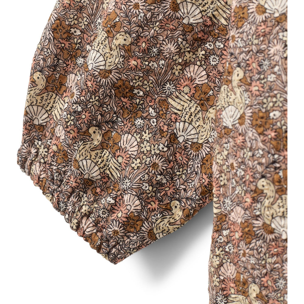 - Ekstra: •Bluse • Brunt mønster med blomster og små ænder Lange ærmer • Designet i en løs pasform med elastisk kant i nakke og ærmer