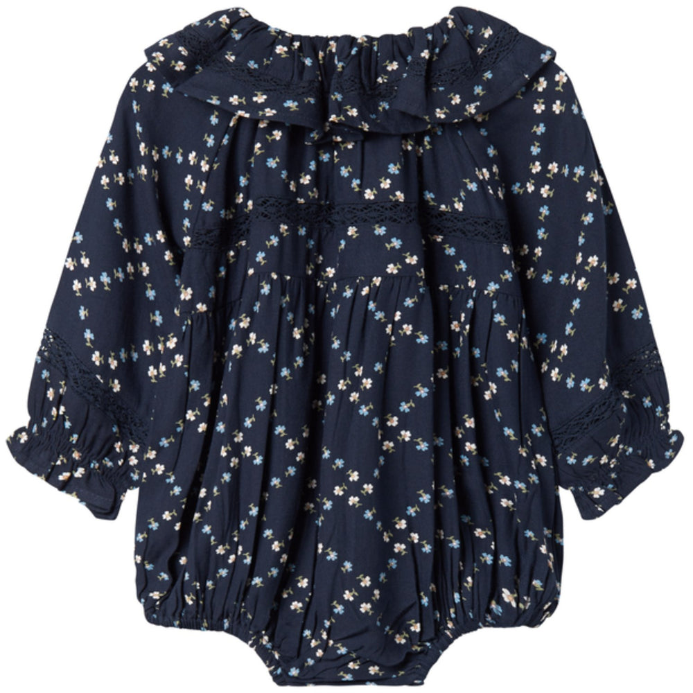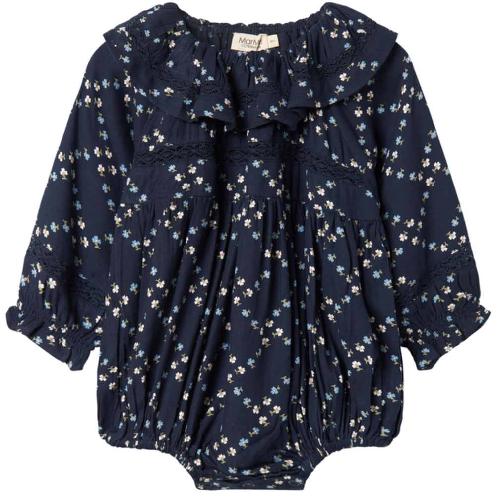 Denne MarMar sparkedragt i viskose twill er udført i French Flower-design, der tilføjer en charmerende flair med sin fine blomstermønstring. Det bløde materiale og løstsiddende snit sikrer komfort hele dagen, mens de praktiske trykknapper mellem benene gør bleeskift let og ligetil. Lange ærmer og en delikat blondekrave fuldender det stilfulde udseende.