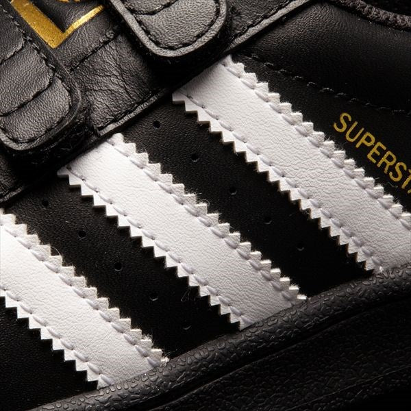 adidas klassiske superstar sneakers. Disse i en klassisksort læder med hvide striber. Skoen lukkes med velcrostropper, hvilket gør det nemt at få dem af og på.