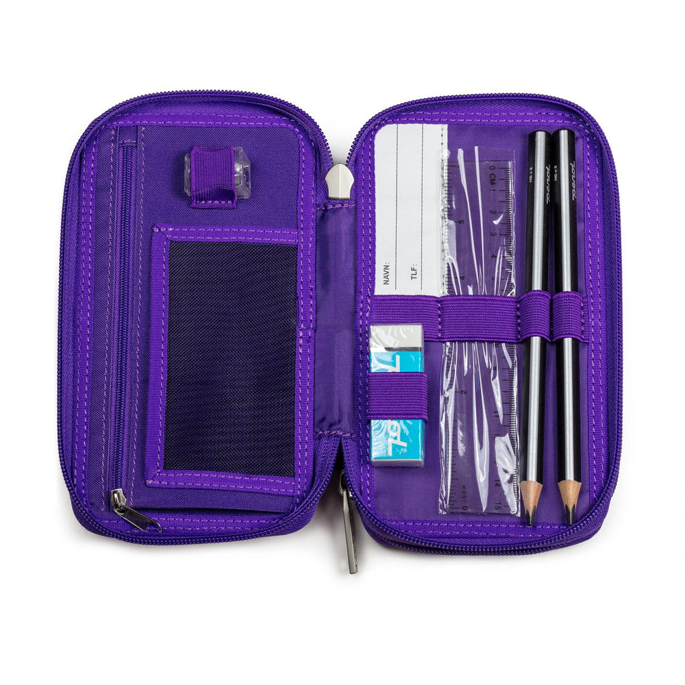 JEVA Unicorn Penalhus Med Fyld Twozip 8865 er både smart og praktisk for dit barns skolebehov. Med specialdesignet navneskilt og separate rum til UNI-login og kopikort sikrer penalhuset nem organisation og sikker opbevaring af skolematerialerne. Dette penalhus inkluderer ergonomisk udformede kvalitetsblyanter og farveblyanter, der fremmer en korrekt skrivestilling og øger børnenes skrivekomfort. Med en stor lynlåslomme og en praktisk meshlomme, er alt lige ved hånden. Dens robuste design passer perfekt til JEVAs skoletasker, hvilket sikrer, at penalhuset forbliver på sin plads.