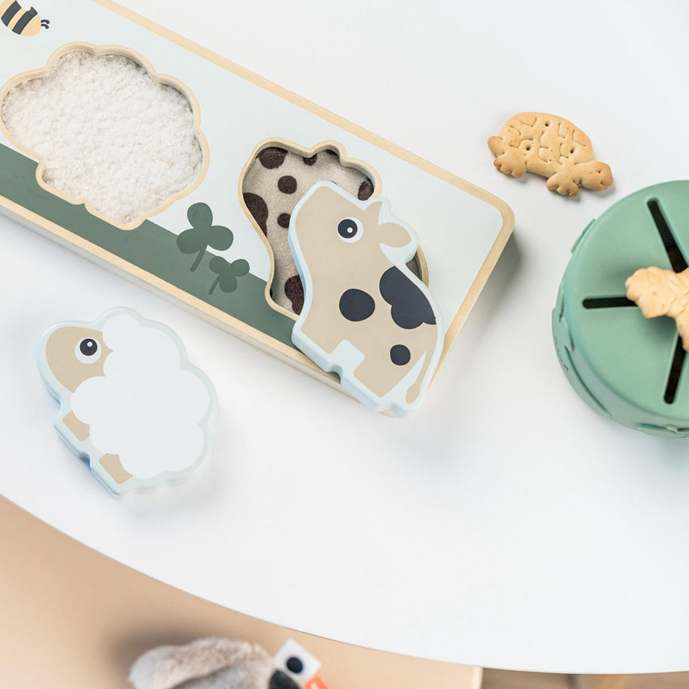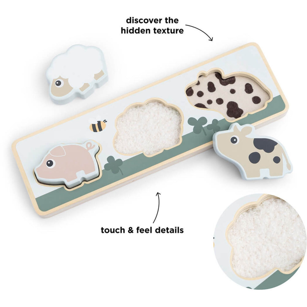 - Ekstra: • Sensoriske puslespil med stimulerende detaljer som teksturer og mønstre at udforske • Træner logiske tænkning og finmotorik, når dit barn matcher brikkerne med baggrunden • Brug brikkerne til at lege, finde på sjove historier og øve dyrelyde • Lavet af ansvarligt fremstillet træ og vandbaseret maling, der er sikkert for dit barn at lege med • Kontraster og farverige detaljer for visuel stimulering