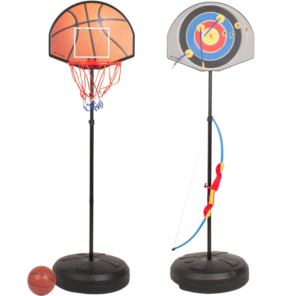 - Ekstra: Stander med 2 spil i 1 Basketkurv med net Bueskudning med 3 pile med sugekopper Justerbar i højden 102-136 (til kurv) Backboard i Polyethylen Backboard størrelse: 48 x 38 cm Base på ca. 15 l Vægt 3,5 kg Medfølger plastbold, pumpe, bue og 3 pile Til børn fra 6+ år