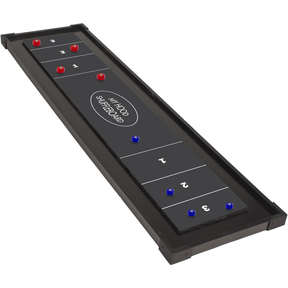My Hood Shuffleboard er det perfekte tilbehør til familiens udendørs legetid, som sikrer timevis af underholdning og leg. Dette spil kombinerer shuffleboard og curling på en lakeret vendbar træplade, hvilket sikrer glid og holdbarhed. Med otte pucks i to farver fremmer det både motoriske færdigheder og konkurrenceånd på en sjov måde. Spillet er let at opsætte og kan nemt opbevares. En fantastisk måde at styrke båndene i familien på gennem leg og udfordringer.