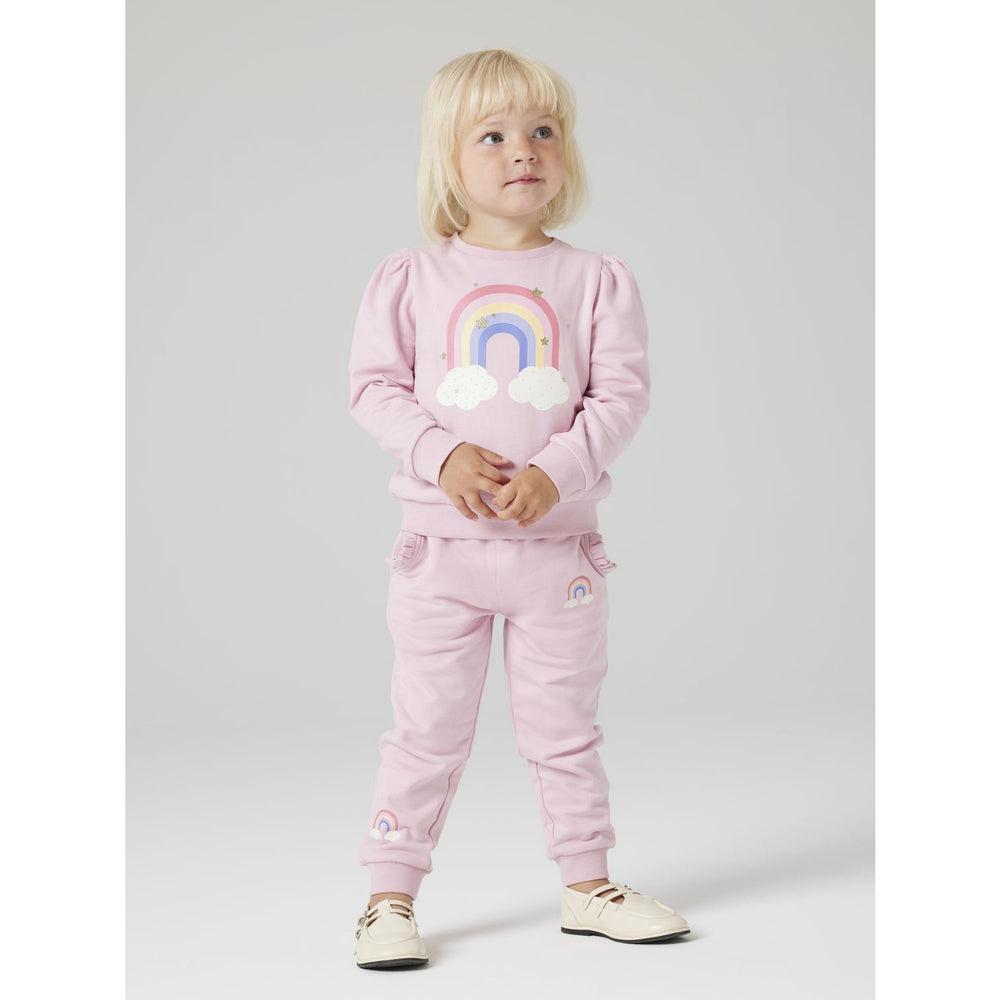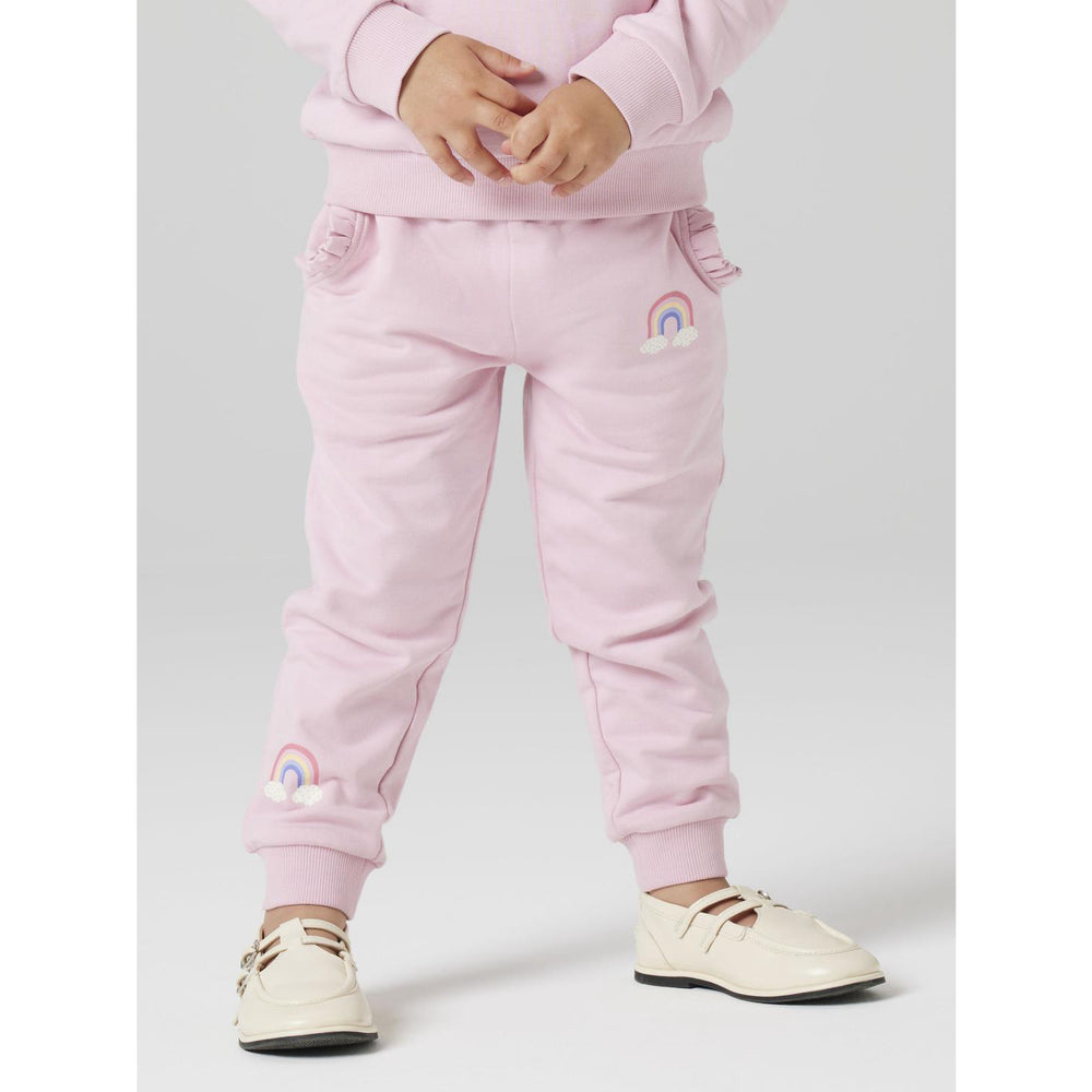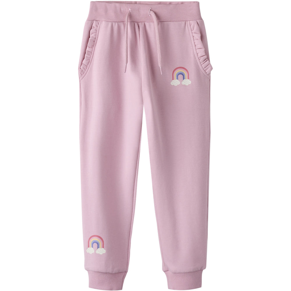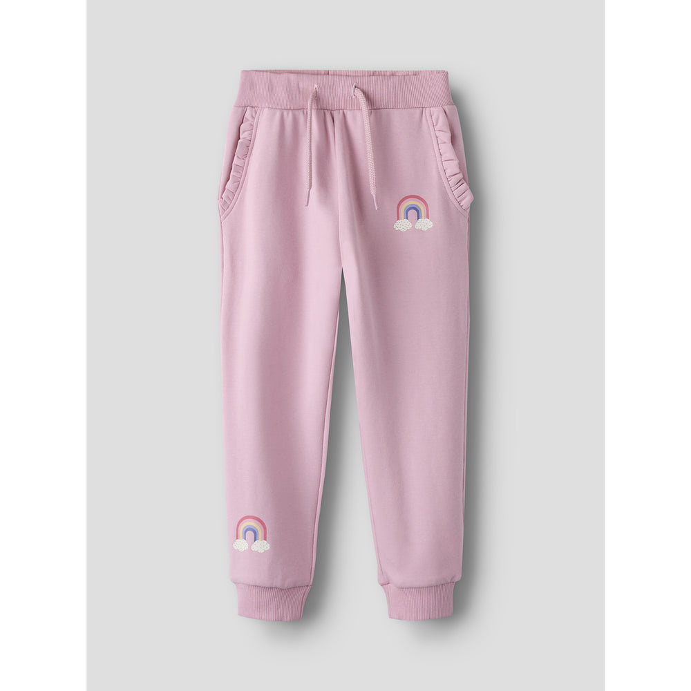 Klæd dit barn i Name It Cameo Pink Nmflina bukser, perfekte til hverdagsbrug og afslapning. Disse bukser er fremstillet i en lækker blanding af bomuld og elastan, hvilket sikrer både holdbarhed og strækbarhed. Det bløde, børstede sweatstof indvendigt forstærker komforten, mens ribkanter og en elastisk ribtalje giver en fremragende pasform. Praktiske sidelommer og charmerende flæsedetaljer kombineret med et subtilt pigmentprint gør disse bukser både stilfulde og funktionelle. Ideal til aktive børn der værdsætter bevægelsesfrihed og stil.