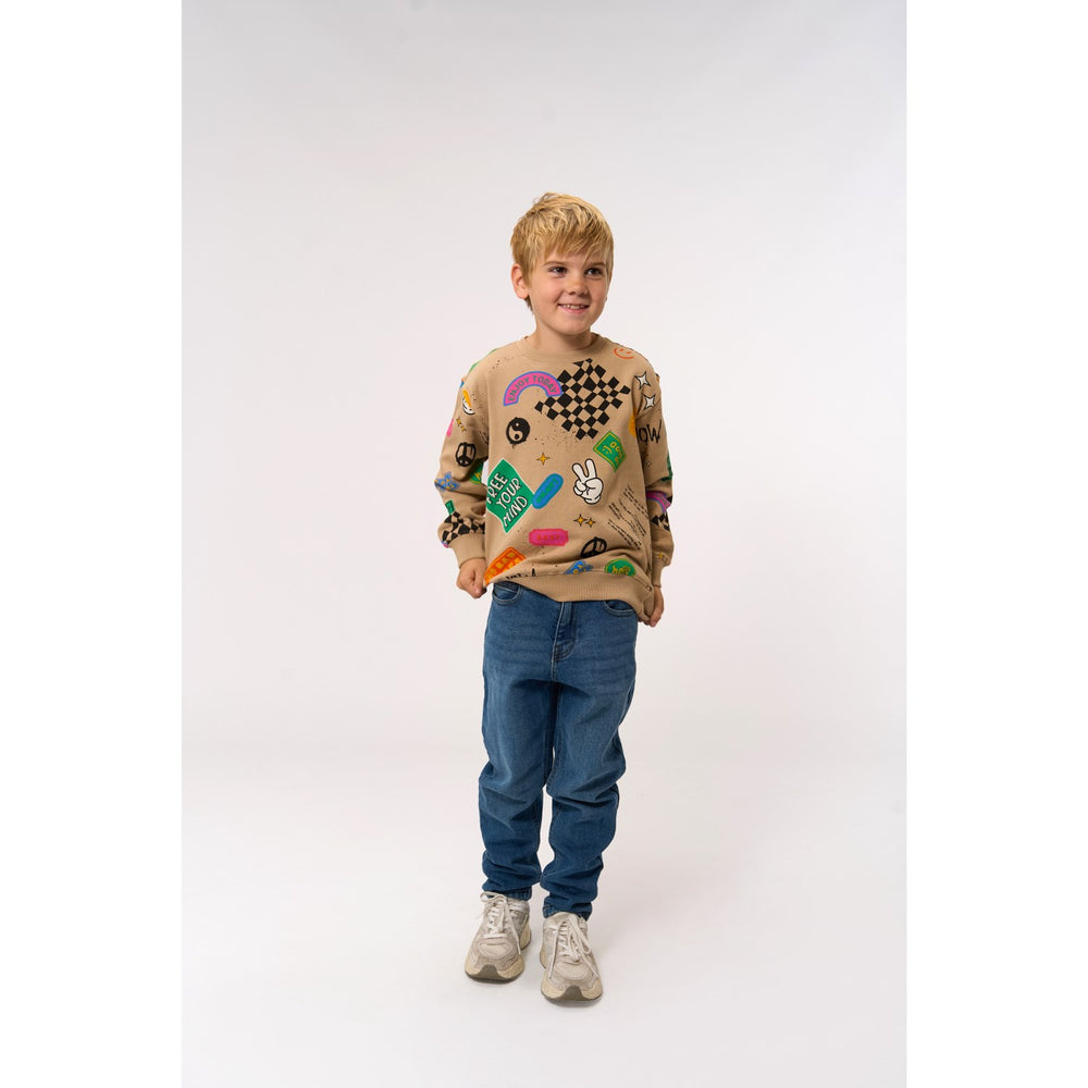 Giv dit barn et farverigt og kreativt udtryk med denne overdimensionerede sweatshirt fra THE NEW. Designet med et iøjnefaldende all-over print, der omfatter tern, fredstegn og inspirerende tekster som "Free Your Mind", kombinerer denne trøje stil med komfort. Det økologiske bomuld certificeret af GOTS sikrer en blød og behagelig oplevelse, perfekt til hverdagens eventyr. Et trendy og børnevenligt valg for den modebevidste unge.