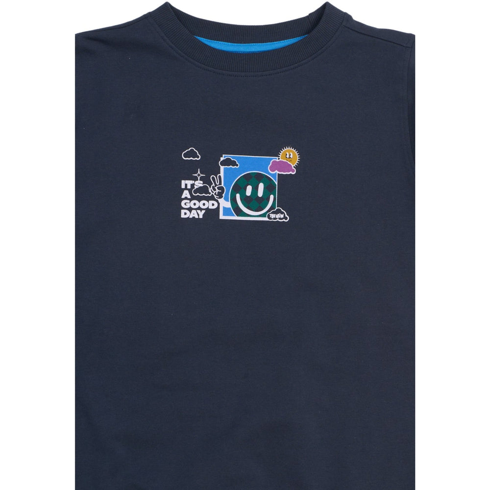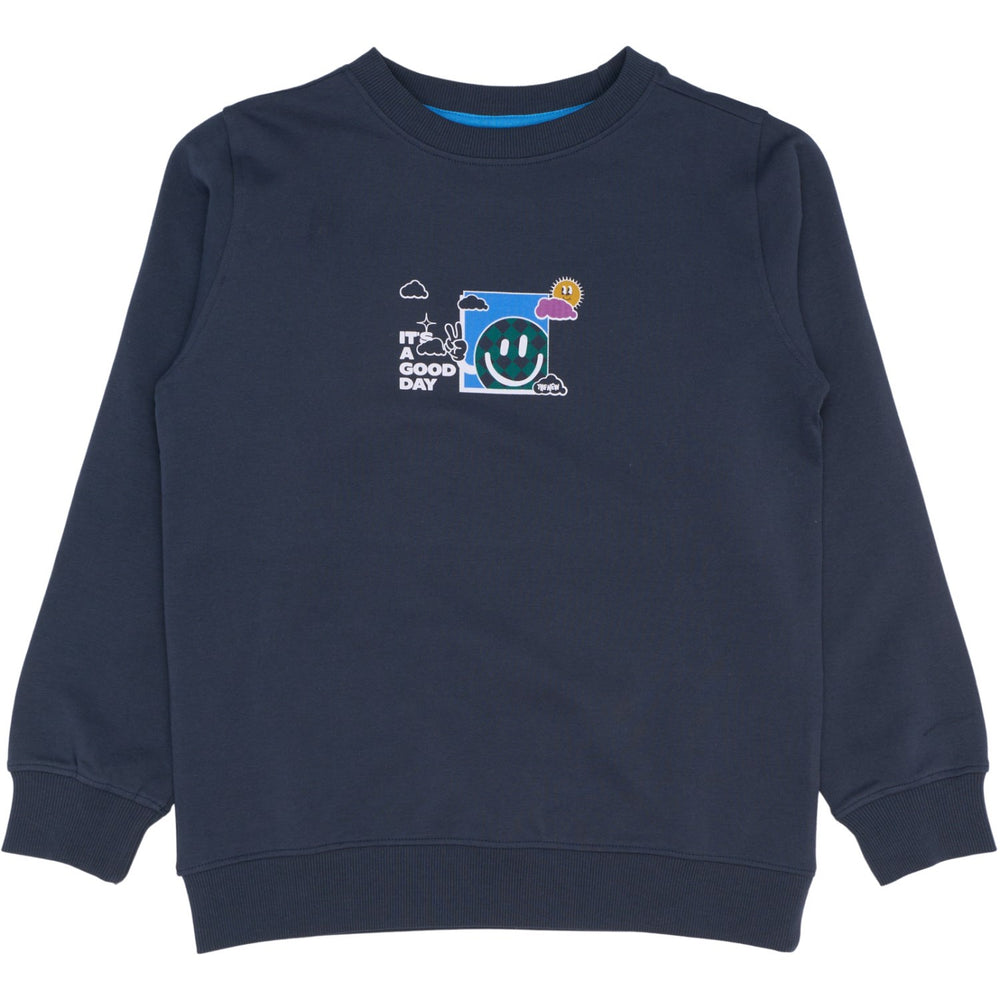 Gør hver dag lidt sjovere med denne charmerende sweatshirt fra THE NEW, prydet med et livligt og farvestrålende print. Fronten viser et smilende ansigt omgivet af tern, sol og skyer, sammen med teksten "It's a good day", der indbyder til positivitet. På ryggen udvides dette glædesspredende tema med en større smiley og ordene "hver dag". Sweatshirten er fremstillet i GOTS-certificeret økologisk bomuld, hvilket garanterer både miljøvenlighed og blødhed, ideel til børns sarte hud. Med dens runde halsudskæring og behagelige pasform er den ikke blot stilfuld, men også komfortabel for dit barn at have på. Er tilgængelig i to forskellige farver for at matche enhver stil og smag.