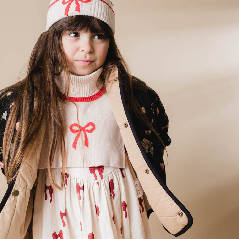 Denne charmerende Almond Peach Louise halsedisse er strikket af blød økologisk bomuld, der sikrer varme og komfort til dit barn. Med sit fine sløjfedesign og den tilhørende harmoniske farve, passer den ideelt sammen med Leonora-huen for et komplet stilfuldt look. Let at passe med almindelig vask, halsedissen kombinerer funktionalitet med et sødt udseende, perfekt til kølige dage.