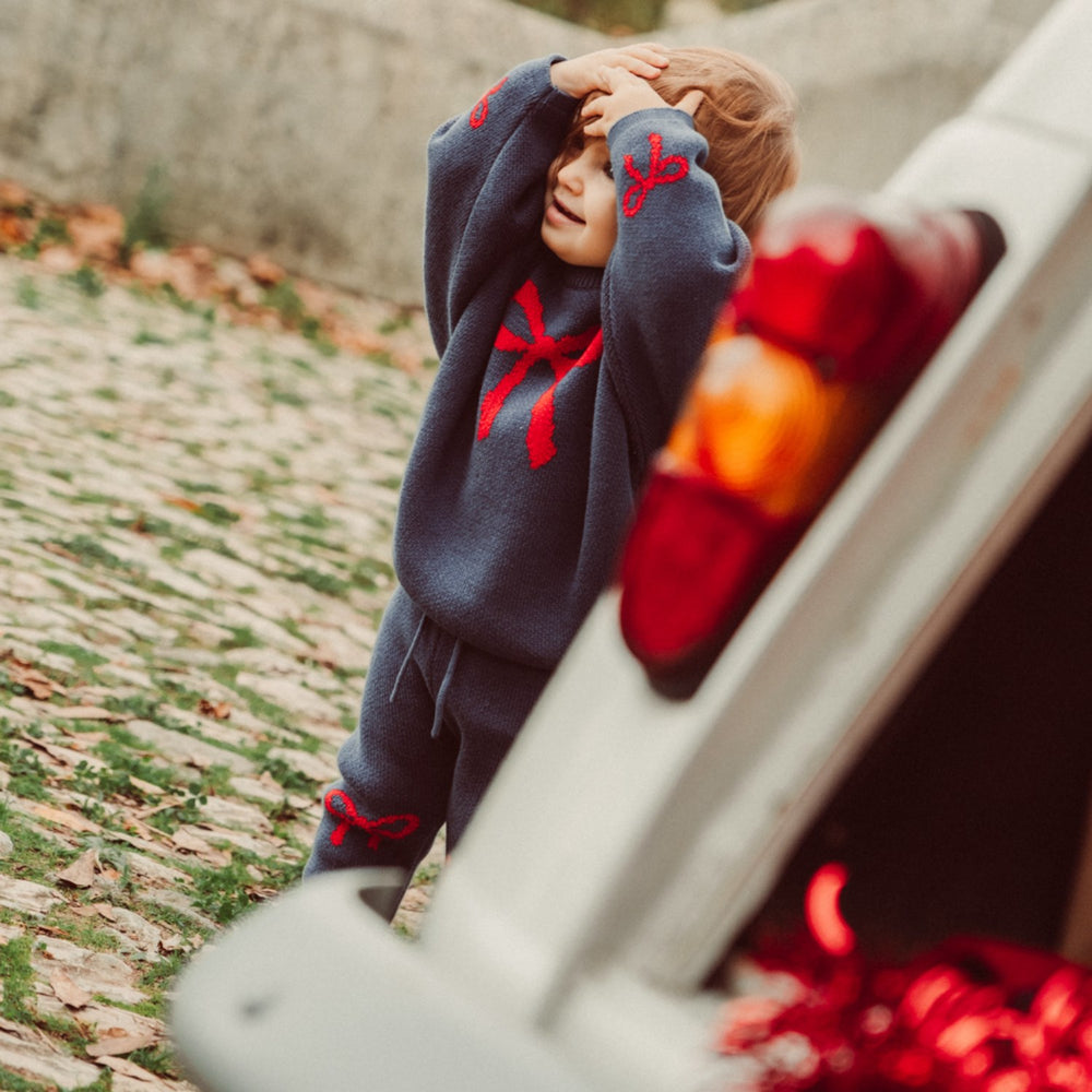Opdag charmen ved disse strikkede bukser i stilfuldt blåt fra That's Mine. Designet med søde sløjfedetaljer ved knæene, som tilføjer en legesyg finesse. Bukserne har en elastisk talje og justerbar snøre for optimal pasform og komfort. De er ideelle til både leg og afslapning og en essentiel del af ethvert barns garderobe.