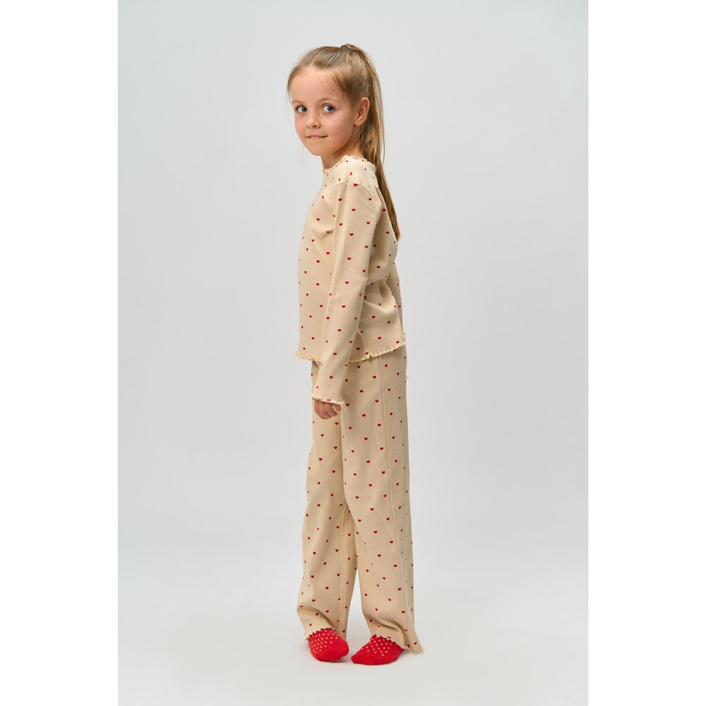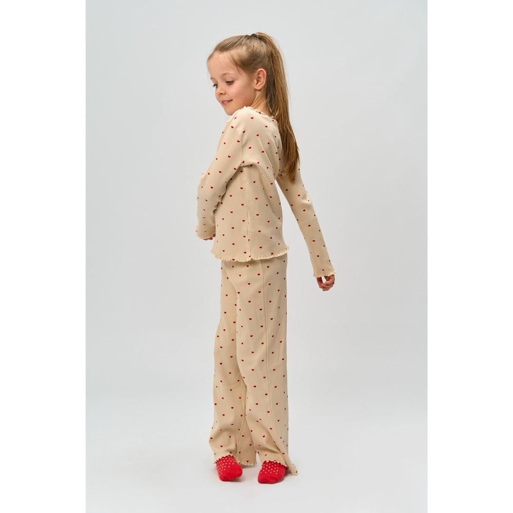 Nyd de fredelige aftener og søvnfyldte nætter med New Gardenia AOP Holiday Heart Rib Natsæt fra THE NEW. Dette nattøjssæt er fremstillet i blødt, økologisk GOTS-certificeret ribstof, der tilbyder en behagelig og strækbar pasform. Cremefarven kombineret med det kærlige hjerteprint tilfører et stilsikkert og sødt udtryk, ideelt til både afslapning og søvn. Designet inkluderer en langærmet bluse og matchende bukser, begge afsluttet med babylock kanter for ekstra holdbarhed. Sættet er perfekt til at skabe matchende outfits for hele familien under feriesæsonen.