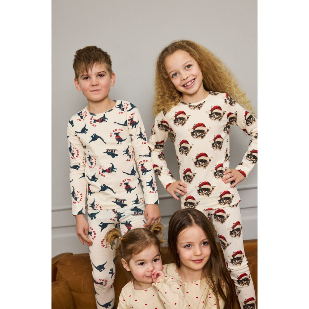 Fejr julen med hyggeligt og sjovt nattøj fra THE NEW. Dette behagelige sæt er fremstillet i GOTS certificeret økologisk bomuld, der tilbyder både holdbarhed og blødhed. Udstyret med en langærmet bluse og matchende leggings, sikrer dette rib-nattøjssæt en komfortabel fit gennem hele natten. Vælg mellem to charmerende designs: enten katte med nissehuer eller juledinosaurer, begge fulde af festlig glæde. Ideel til julehygge eller som en sjov gaveidé. Sættet er tilgængeligt i almindelig pasform såvel som til voksne.