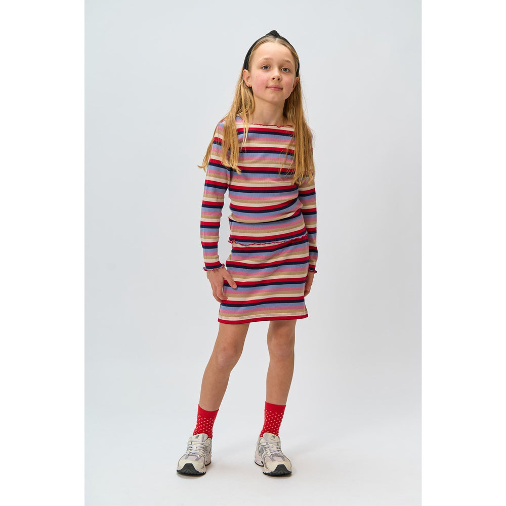 Introducer din lille til en verden af farver med THE NEW Multi Striped Rosie L_S Rib Tee. Denne charmerende langærmede bluse er designet med øje for detaljer og komfort. Fremstillet i en blød ribkvalitet, sikrer den optimal bevægelsesfrihed og en behagelig pasform dagen lang. Blusen præsenterer et farverigt stribet mønster, der tilføjer stil og legesyge til ethvert børnegarderobe. Med babylock-kanter ved ærmerne og halsudskæringen tilføjes et delikat feminint touch. Kombiner denne top med den matchende nederdel fra samme serie for et gennemført og stilfuldt sæt, der er velegnet til både hverdagsbrug og særlige anledninger. Giv dit barn komfort og stil med dette must-have fra THE NEW.