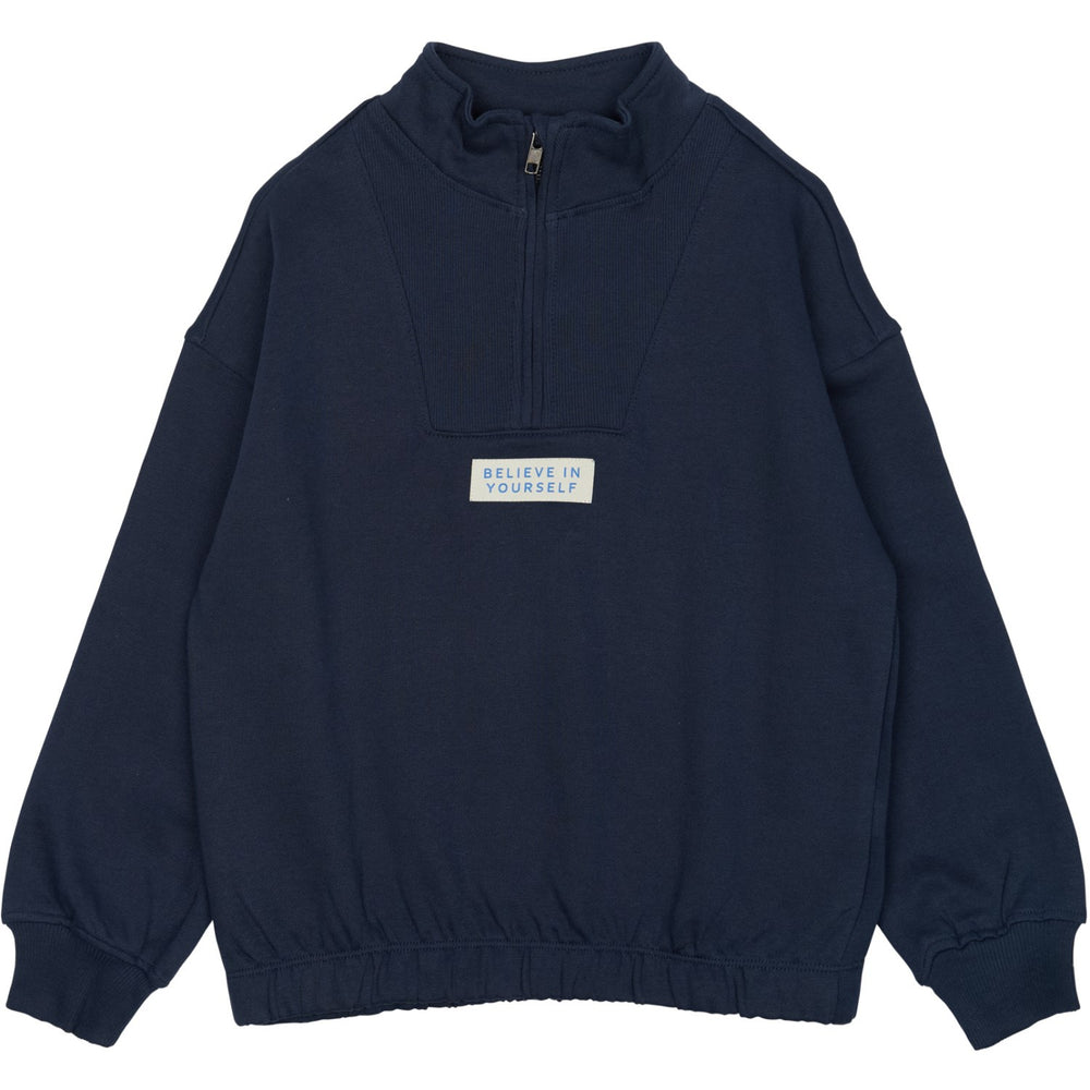 Denne mørkeblå oversized sweatshirt fra THE NEW med halv lynlås forener stil og komfort. Udstyret med ribstrikkede detaljer ved manchetter og omkring lynlåsen, som ikke kun skaber et stilfuldt udtryk, men også sikrer en forbedret pasform. Den er prydet med et motiverende budskab, "tro på dig selv", på brystet, som tilfører et positivt og inspirerende element til designet. Den afslappede pasform og den praktiske halvlynlås gør den ideel til daglig brug og let at kombinere med både casual og sporty outfits. Sweatshirten er desuden GOTS Organic certificeret, hvilket garanterer en økologisk produktion.